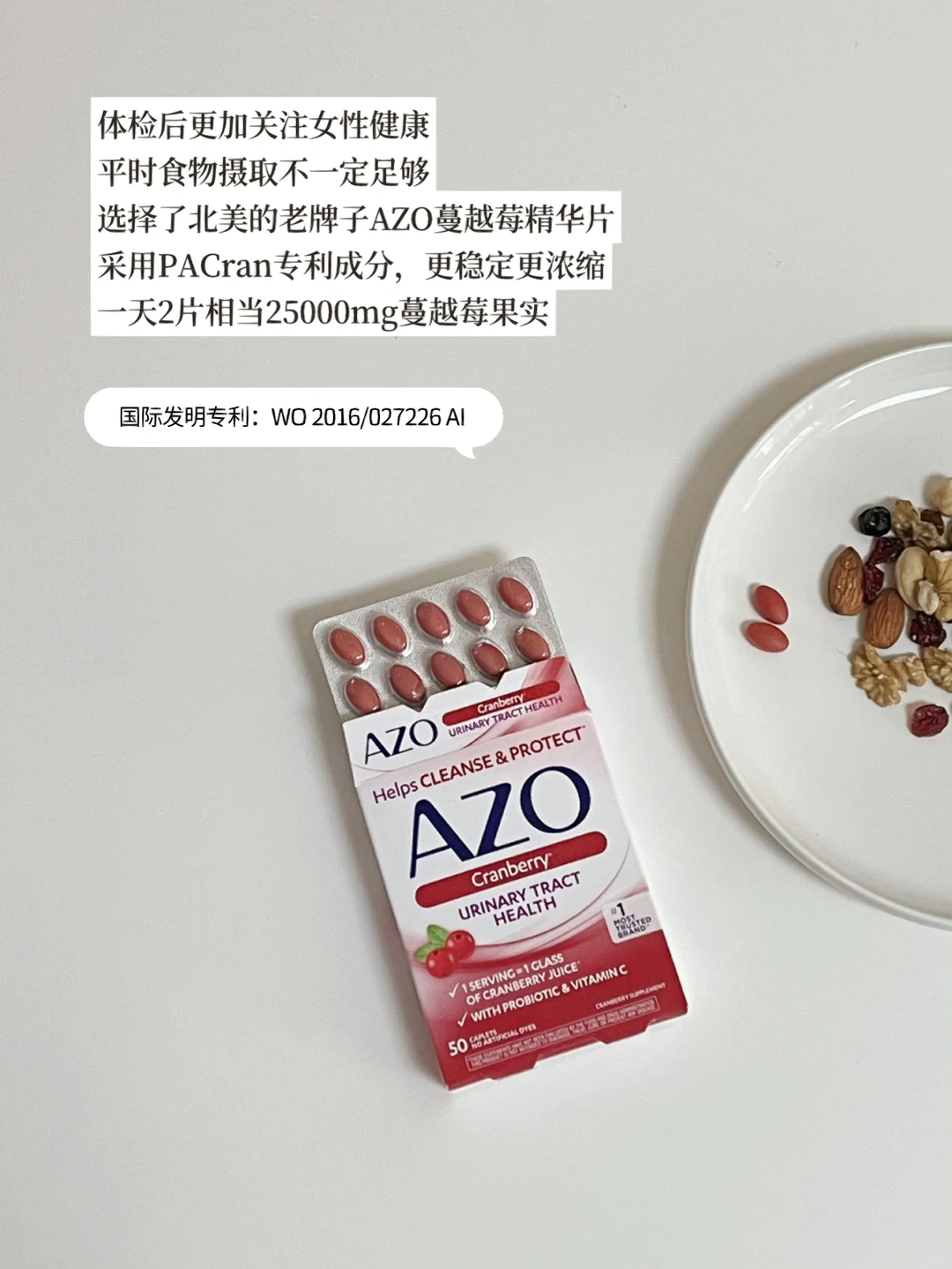 体检后更加关注女性泌尿系统健康。保持每天足量饮水习惯、多吃莓果,还选择了来自北美的老牌子[AZO蔓越莓]精华片。采用PACran专利成分(国际发明专利:WO 2016/027226 Al ),还配合了女性益生菌和VC,更稳定更浓缩。
