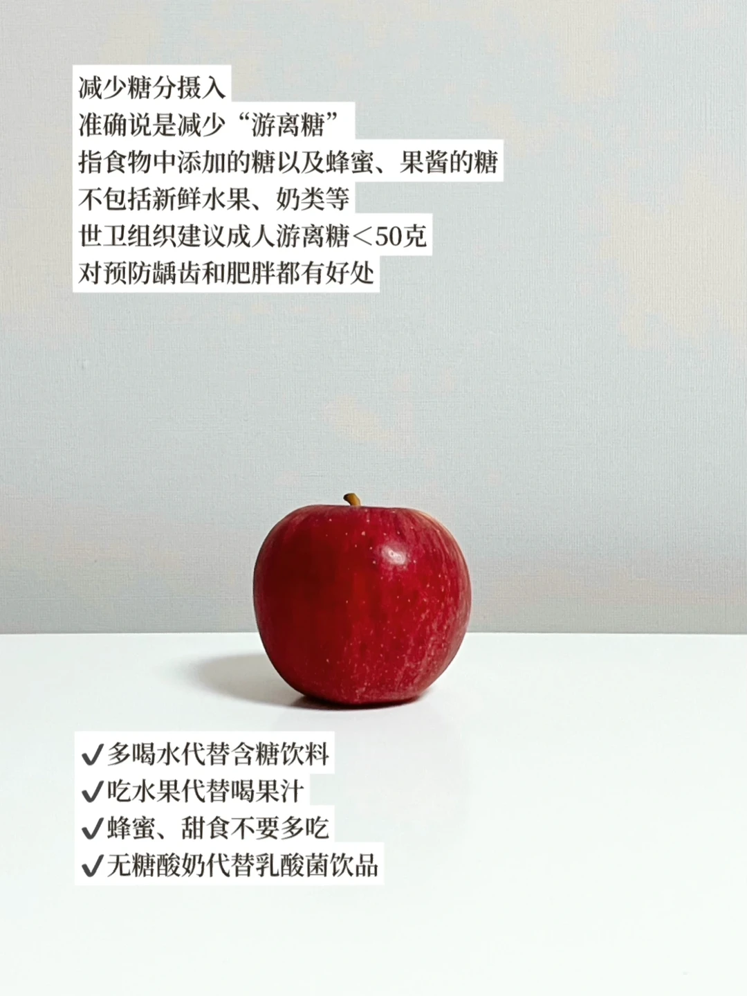 准确说是减少“游离糖”,指食物中添加的糖以及蜂蜜、果酱的糖,不包括新鲜水果、奶类等。世卫组织建议成人游离糖<50克/天。