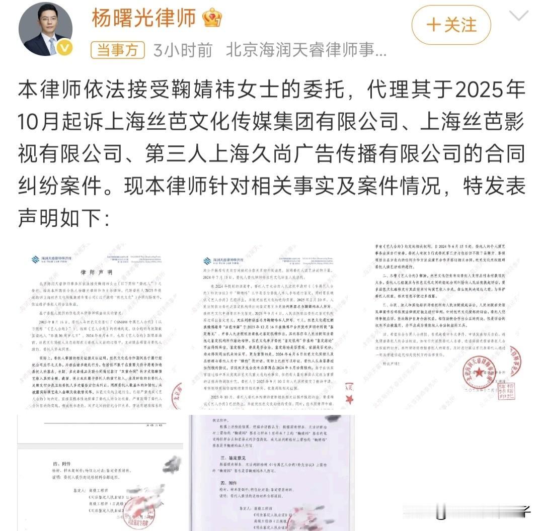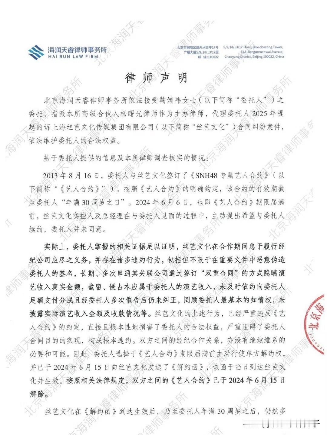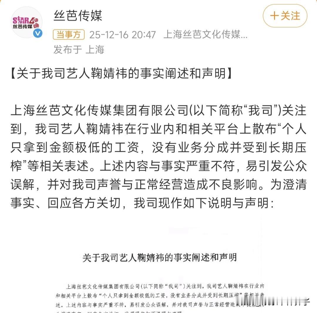 直接开撕!丝芭传媒称已支付鞠婧祎1.39亿…… 12月16日,鞠婧祎和经纪公司丝芭传媒的合约纠纷引发热议。 鞠婧祎委托律师起诉丝芭,并对案件情况发布声明。 丝芭也不甘示弱,在社交平台发文回应,称鞠婧祎的表述与事实不符,表示已支付税前收入1.39亿。 同时提及给艺人的待遇: 1、155平米外滩江景房并升级了更大面积的市区住房 2、每月25万元固定工资 3、专属司机以及奔驰车 4、专属工作室并配专职工作人员 5、报销额外的旅游、生活费用 按照丝芭的说法,为艺人付出了很多,包括精心包装,规划个人发展路线。 然而,再看鞠婧祎委托律师发布的声明,貌似又不是这么回事,到底谁对谁错,一时间很难分辨。 翻看鞠婧祎去年解约时的发文,语气十分平和,显得也很体面,没想到,最后闹到这种程度。 看这架势,双方彻底撕破脸了,后续如何发展,不得而知。 如果没记错,赵露思和经纪公司解约时,也是闹得不欢而散。 咱就说,难道就不能好聚好散?这样对彼此都好吧!