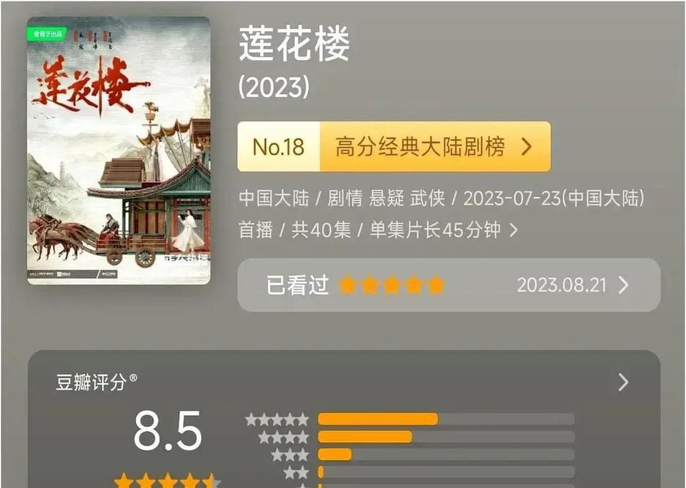 别问哪部剧更好。 你昨晚点开哪一部,已经暴露了你最近最缺什么。 手指划开抖音,180亿次播放量托起《莲花楼》。 你刷到的是成毅破碎感的眼神,是每一帧能截成壁纸的美学,是全网二创让你嘴角上翘的CP感。 它喂给你的,是30秒一次的情绪糖丸。 拇指按下暂停键,在B站深度解说里啃《天行健》。 你记下“电报局按钮”的还原细节,推敲台词里的历史隐喻。12万人打出9.1分,清华教授把它搬进讲堂,《人民日报》为编剧团队留出版面。 它递给你的,是一把需要费劲拧开的思想扳手。 25岁以上的男性,在职场绞肉机里出来,渴望一点厚重的精神压舱石。30岁以下的女性,在生活琐碎间隙,伸手接住一颗即时降落的糖。 没有高下,只有需求。 《莲花楼》是周五晚上的气泡酒,一口解千愁。 《天行健》是周日清晨的手冲咖啡,苦后回甘悠长。 你的播放记录,是你灵魂近期的体检报告单。 不是在追剧,是在选择今夜,用情绪止痛,还是用思想武装。