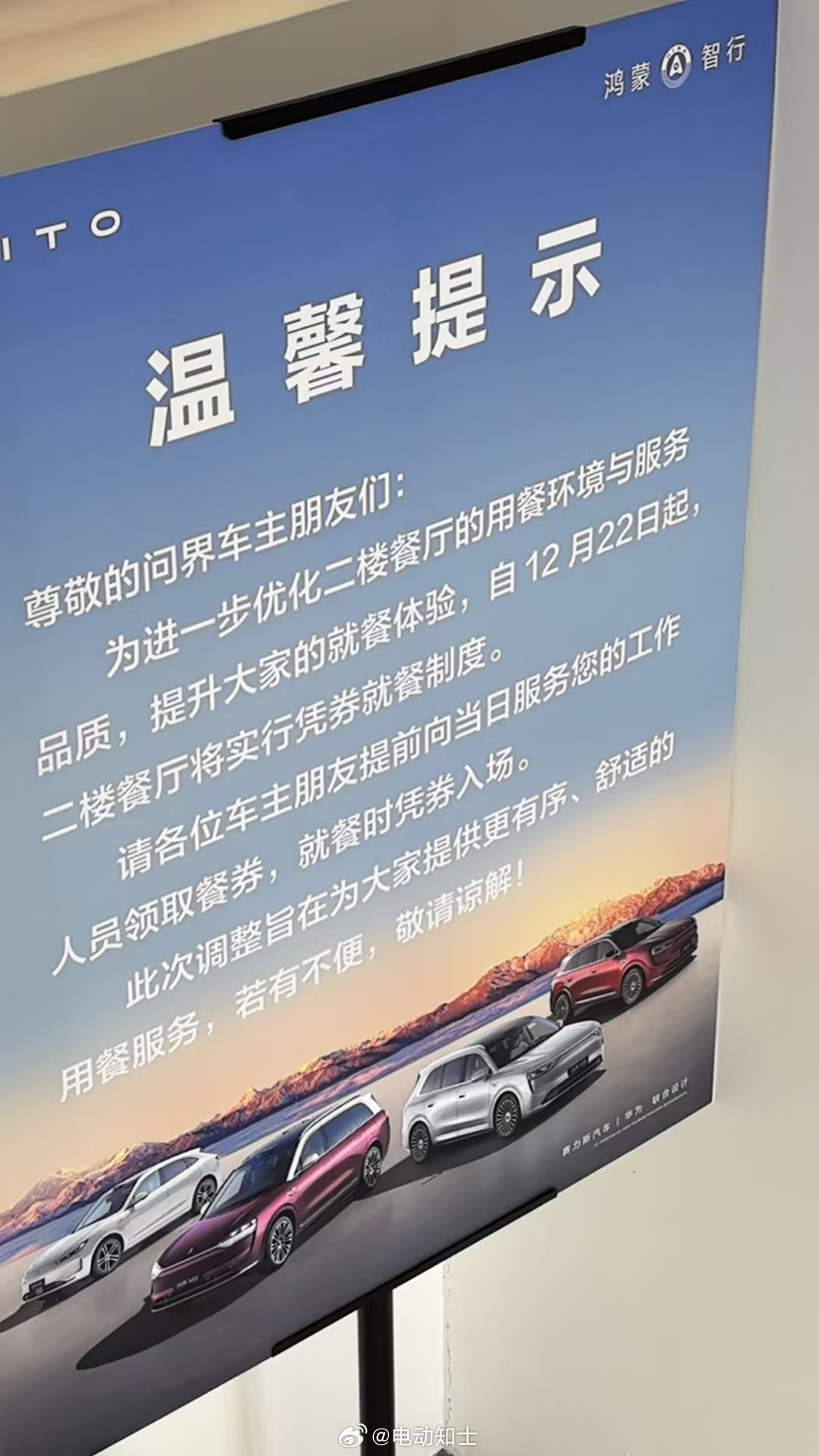 鸿蒙大饭店“倒闭”了,可能是流量太大影响到正常运转了[捂嘴哭] 停止一切“鸿蒙智行大饭店”宣传,并清除各平台历史宣传素材。禁止免费充电、免费洗车与餐饮,自2025年12月16日起执行。 鸿蒙智行新能源汽车