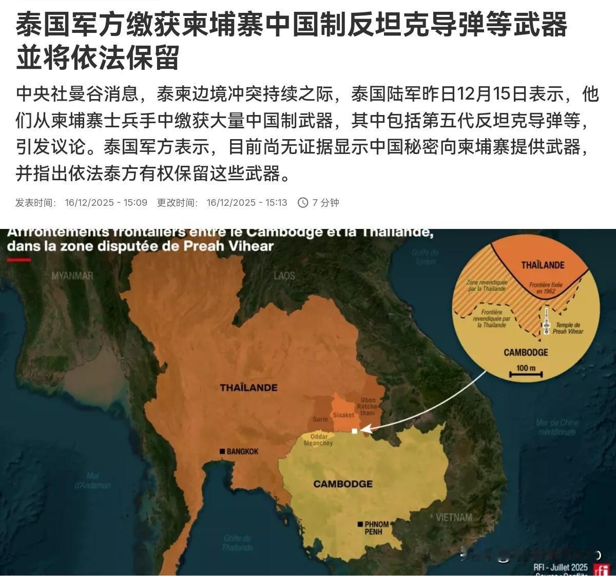 泰国对我们说了一句硬话!泰国表示,即便中国施压,缴获的武器也不会归还给中国!12月16日,根据法新社报道,法媒称,泰国陆军从柬埔寨士兵手中缴获大量中国制武器,其中包括第五代反坦克导弹。法媒称,该系统专为反装甲和精确打击任务而设计,并于今年初正式亮相,目前仍在全球范围内有限部署。 而这款第五代反坦克导弹系统,配备先进的瞄准技术,标准射程为6至10公里。对于缴获的武器,泰国国防部发言人苏拉桑表示,根据国际法,即使北京提出要求,泰国也没有义务将该武器归还给制造国。很显然,在缴获来至于柬埔寨的中式装备之后,泰国这是专门点了我们的名。无疑,泰国的口风明显有一点硬。 当然,为什么泰国方面专门就此事进行表态呢?恐怕,泰国有两方面的考虑。其一,泰国这是想要动摇柬埔寨的军心,泰国无疑是想要告诉柬埔寨,即便柬埔寨装备先进的中式装备,柬埔寨也不堪一击。其二,泰国也是有意对我们施压,希望我们保持中立。虽然泰国自己也澄清,中国没有在冲突之后向柬埔寨运送武器,但泰国不希望我们插手的意味非常的明显。 不过,事实却是不管是泰国,还是柬埔寨都有不少来自于中国的装备。某种程度来说,只要我们稍微发一点力,就极有可能改变战局。当然,从我们角度而言,就算泰国没有出来喊话,放消息,我们的立场也是会保持中立,我们也根本不打算要泰国缴获的准备。再说的透彻一点,利用泰国敲打一下柬埔寨完全是有必要的,尤其是打击柬埔寨境内诈骗园区,泰国还要加把劲。