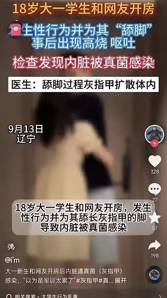 18岁大学生约网友开房, 为寻求刺激玩舔脚! 居然让灰指甲真菌钻进内脏,从脚趾不适拖到反复发烧、暴瘦,治疗又疼又费钱,父母急得四处筹钱,这哪是一时冲动,分明是拿健康赌刺激。 很多人觉得灰指甲只是小毛病,却不知道真菌一旦突破皮肤屏障,对免疫较弱的年轻人来说,可能引发致命的深部感染。 所谓的“新奇体验”背后,藏着看不见的健康陷阱,而年轻人缺的从来不是勇气,是对风险的敬畏和正确的自我保护认知。 别把无知当个性,身体的代价从来都不可逆。你身边有没有人踩过类似的坑?来评论区聊聊该怎么给年轻人普及健康防护意识~