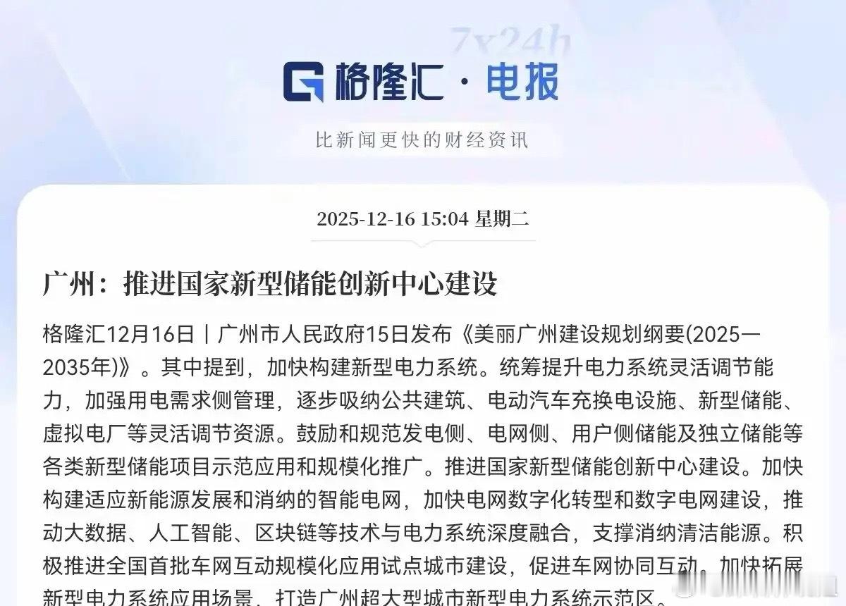 利好总是在盘后!!!一、这一板块迎来利好催化!!!广州发布《美丽广州建设规划纲要(2025—2035年)》,核心聚焦新型电力系统构建,明确推进国家新型储能创新中心建设,统筹吸纳新型储能、虚拟电厂、电动汽车充换电设施等灵活调节资源,鼓励全场景储能项目推广,同时推动大数据、AI、区块链与电力系统融合,打造超大型城市新型电力系统示范区,利好新型储能、虚拟电厂、智能电网、车网互动及电力数字化产业链。二、受益概念股Top20梳理1. 穗恒运A:广州本地能源国企,布局锂电、飞轮、全钒液流电池等储能技术,在建31个储能项目总容量373MWh,2GWh储能智造中心投产,深度受益广州新型储能创新中心建设。2. 广州发展:广州市属综合能源平台,覆盖电力、燃气、储能等业务,中标广州电网储能调频项目,新能源及储能业务毛利率超54%,是本地新型电力系统建设核心标的。3. 梅雁吉祥:参股广东吉洋能源布局飞轮储能,广州地铁18号线飞轮储能项目已挂网试验,技术获国家发改委认可,契合广州轨道交通储能场景需求。4. 国电南瑞:电力自动化龙头,虚拟电厂调度平台接入23个省级电网,2025年前三季度电力自动化营收186亿元,AI与电网调度融合技术支撑广州智能电网建设。5. 阳光电源:全球光储市占率超20%,“光伏+储能+调频”方案适配新能源消纳,海外户储订单增长,为广州新型电力系统提供光储一体化解决方案。6. 宁德时代:全球储能电池出货量第一,587Ah储能专用电芯循环超12000次,2025年三季度储能营收增58%,是广州储能项目核心电芯供应商。7. 东方电子:虚拟电厂全产业链服务商,AI现货价格预测系统误差率低于3%,实施南网首个市场化虚拟电厂项目,适配广州虚拟电厂资源聚合需求。8. 南网储能:南方电网储能平台,运营抽水蓄能与电化学储能电站总装机超12GWh,2025年前三季度储能辅助服务收入增29%,助力广州电网调节能力提升。9. 科陆电子:储能系统集成商,宜春10GWh基地供货国网项目,印尼3GWh基地在建,2025年前三季度净利润增251%,储能业务贡献超60%营收增量。10. 协鑫能科:虚拟电厂零碳服务龙头,接入可调资源超200万千瓦,江苏市场占比30%,其负荷聚合技术可复制至广州车网互动与虚拟电厂场景。11. 金智科技:源网荷储聚合平台服务商,参与长三角虚拟电厂试点,2024年储能系统集成收入增50%,技术适配广州用户侧储能与虚拟电厂建设。12. 许继电气:特高压设备龙头,国内唯一±1100kV换流阀供应商,储能变流器技术领先,为广州智能电网升级提供核心设备支撑。13. 特变电工:新能源并网与输变电龙头,海外EPC覆盖60国,柔性直流输电技术适配广州电网数字化转型,助力新能源消纳。14. 国轩高科:分布式储能标杆,磷酸铁锂电池低温性能领先,德国户储市占率超20%,可为广州工商业储能提供电池解决方案。15. 思源电气:电网智能监测龙头,AI诊断误报率低于0.1%,是国网/南网主供商,技术支撑广州电网安全监测与数字化改造。16. 林洋能源:全球最大智能电表出口商,微电网市占率40%,双向电表与海岛微电网方案适配广州电力需求侧管理。17. 积成电子:电网数字化服务商,国产调度软件市占率30%,数字孪生平台参与国网试点,助力广州电力系统数字化转型。18. 中天科技:海缆与电力传输龙头,500kV海缆技术全球领先,为广州海上风电并网及智能电网提供传输设备支撑。19. 北京科锐:虚拟电厂核心标的,完成能量管理平台技术升级,覆盖新型配电网、储能等场景,其EMS系统可服务广州虚拟电厂调度。20. 科士达:数据中心储能龙头,为阿里云、腾讯云提供光储方案,构网型储能系统毫秒级响应电网波动,适配广州数字电网建设需求。三、总结广州此次长期规划明确了新型电力系统的建设方向,新型储能、虚拟电厂、智能电网成为核心主线,本地能源国企将率先承接项目落地,而具备技术壁垒的储能设备、电力数字化龙头则有望凭借产品与方案优势参与广州市场建设。整体来看,产业链企业将从政策落地、项目招标、技术应用三大维度持续受益,行业迎来规模化发展机遇。本文涉及资讯、数据等内容来自网络公共信息,仅供参考,不构成投资建议!