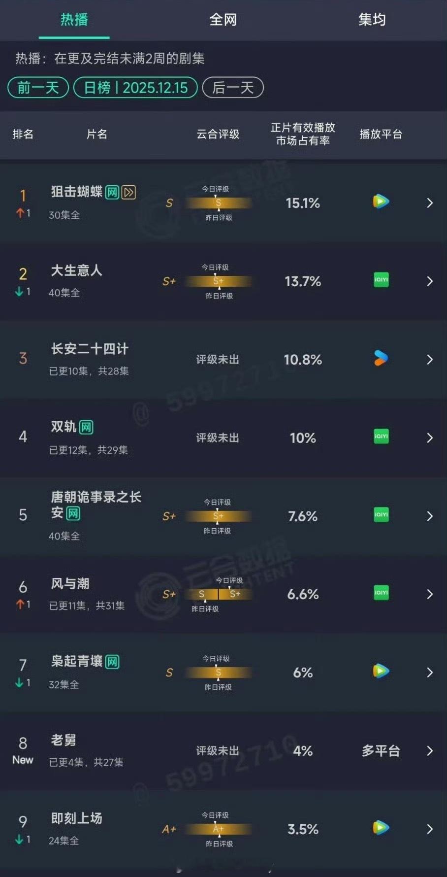 昨日云合🈶狙击蝴蝶15.1%,大结局登顶了长安二十四计10.8%双轨10%
