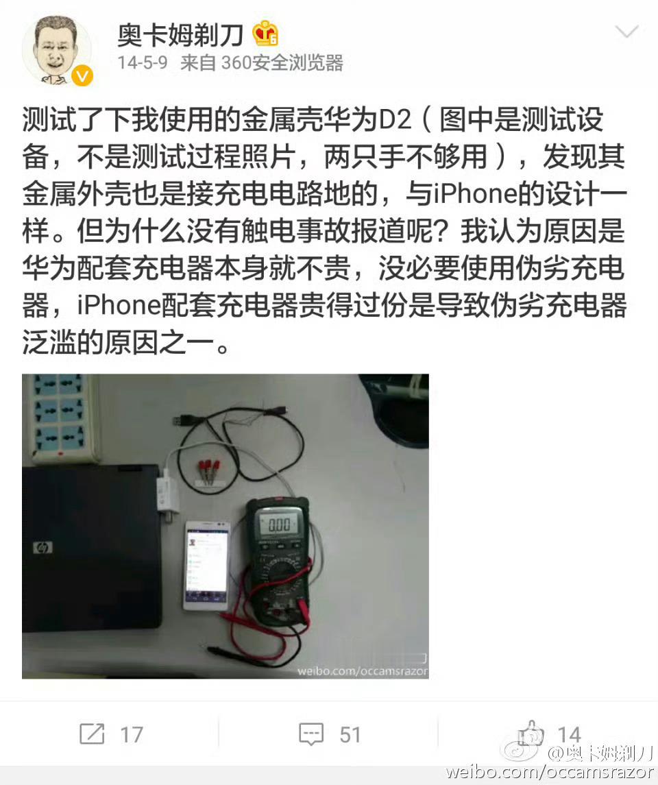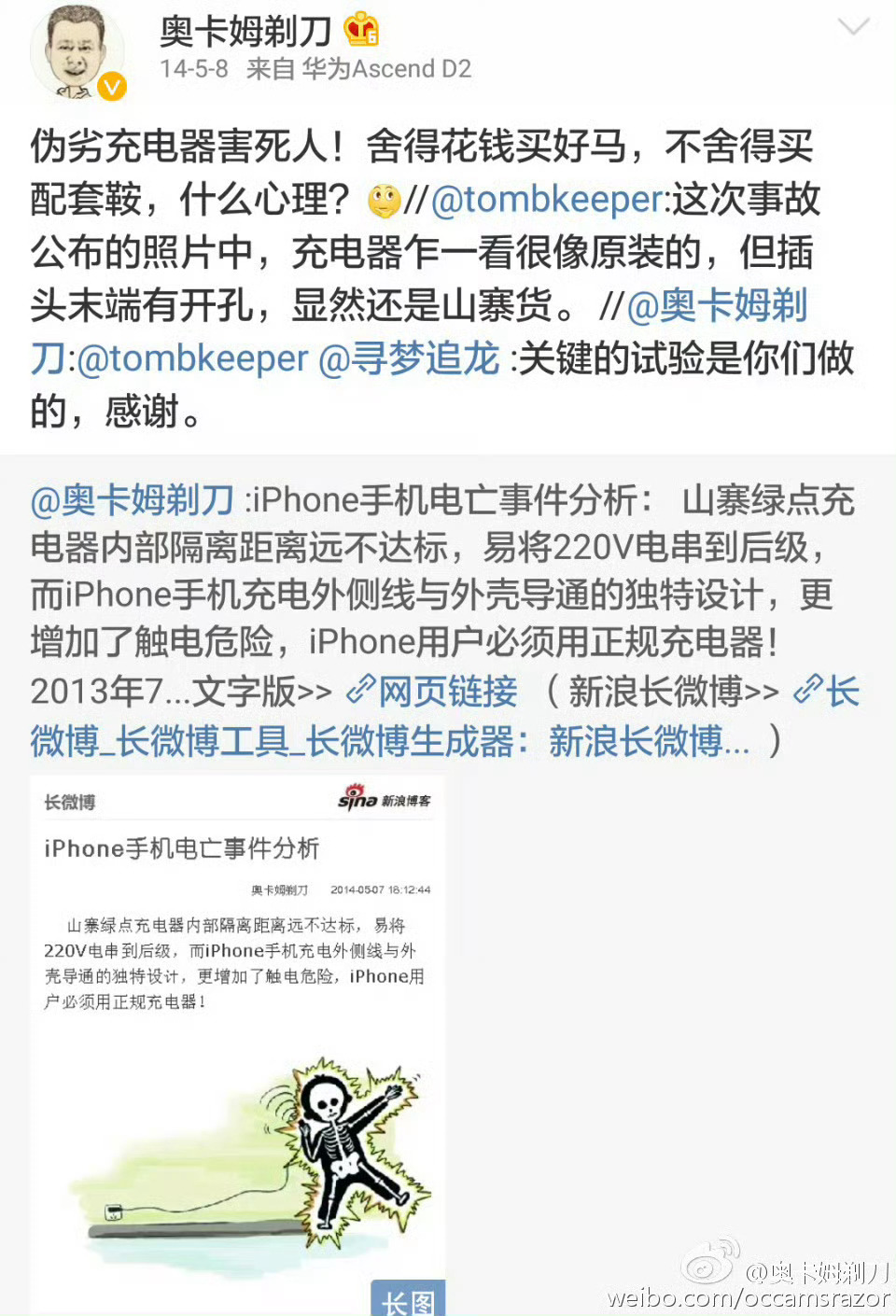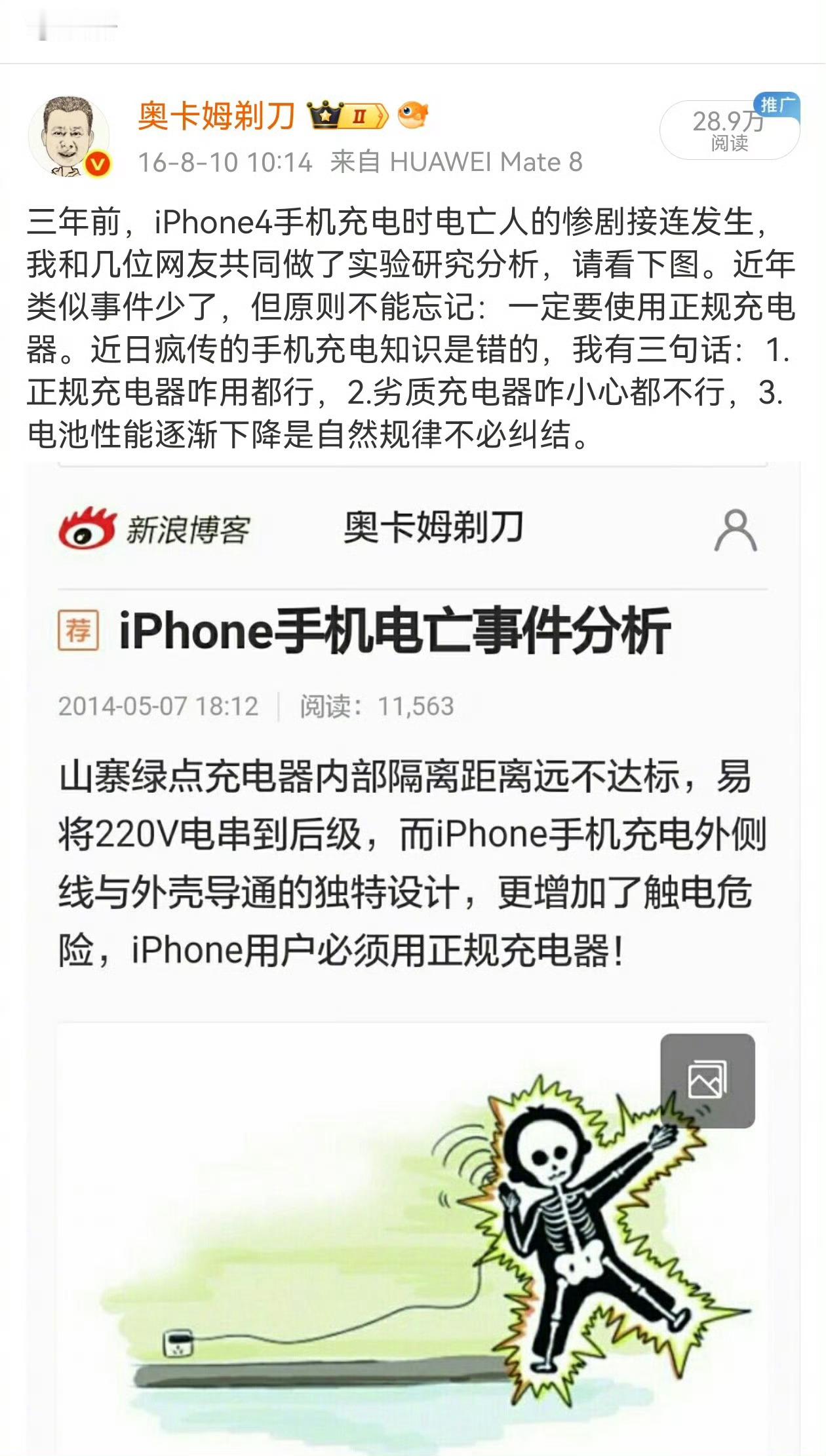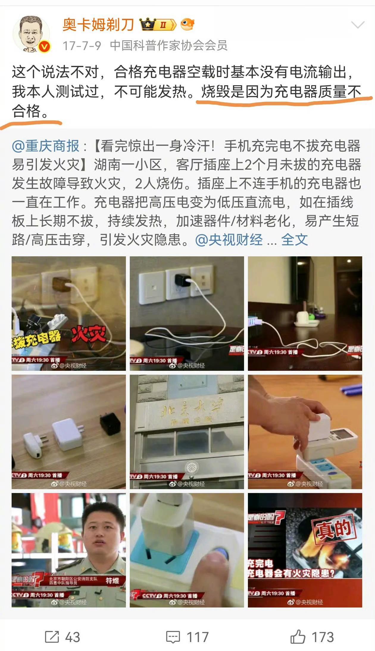 【手机充电器长期插着极易短路 严重时或引发爆炸】手机充电器插着时即使不充电也耗电对于的这个话题,我有完全不同的研究结论:正规充电器长期插着不仅不会短路,而且也不耗电,危险来自不合格的伪劣产品,这是我为期十多年的测试研究。这是涉及公众安全的大事,必须要尊重科学尊重事实。