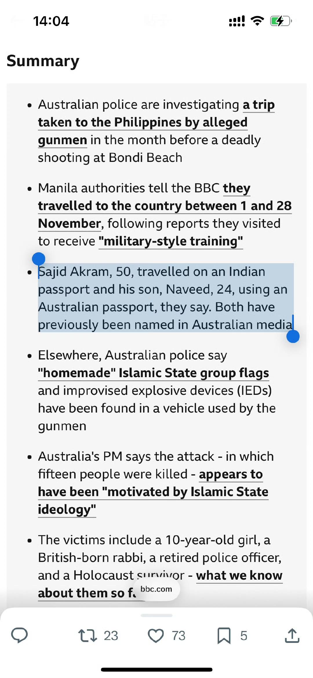 邦迪海滩枪击案两名枪手中的那个父亲,是印度人…… 这是被菲律宾官方爆出来的,因为俩人被曝光曾经去菲律宾接受军事训练,菲律宾移民局回应父亲持印度护照,儿子持澳大利亚护照入境。 印度官员承认了,两名枪手之一Sajid Akram(50岁)是海得拉巴人,他最后一次访问印度是在2022年。印方称,他于1998年持学生签证移民澳大利亚,之后只短暂访问过印度几次。 这下巴基斯坦网友轻松了,疯狂转发这条消息