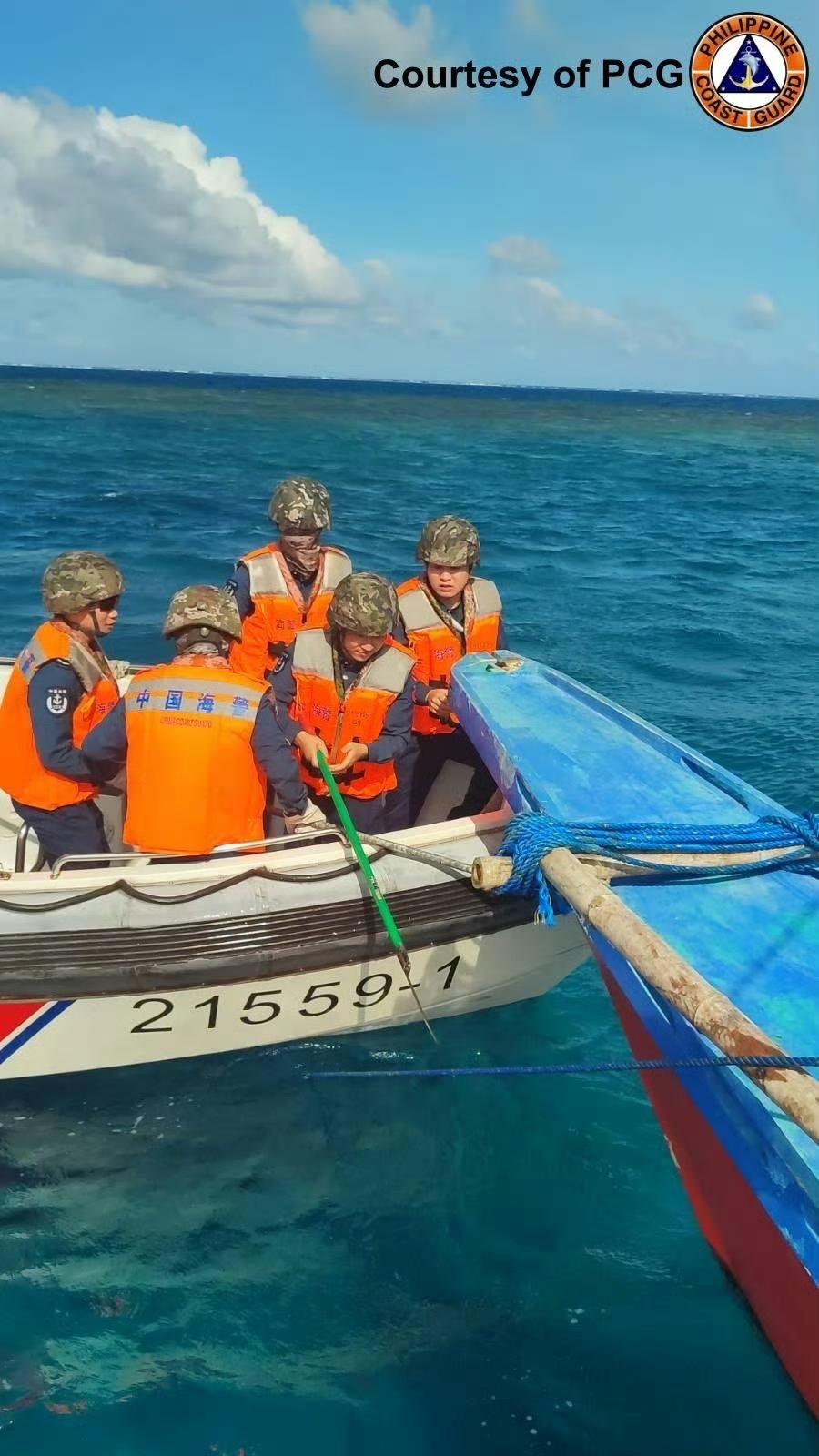 菲律宾海岸警卫队公布的画面:中国渔船使用水炮驱离非法侵闯南沙岛礁的菲律宾船只,同时中国海警依法破坏在南沙群岛岛礁附近(图2,图中可以看到后方的礁盘)非法抛锚的菲律宾船只锚绳。 这才哪到哪儿啊,力度还要加到!只不过这个渔船看起来有点先进啊,只要带了渔网就算渔船也没毛病吧。