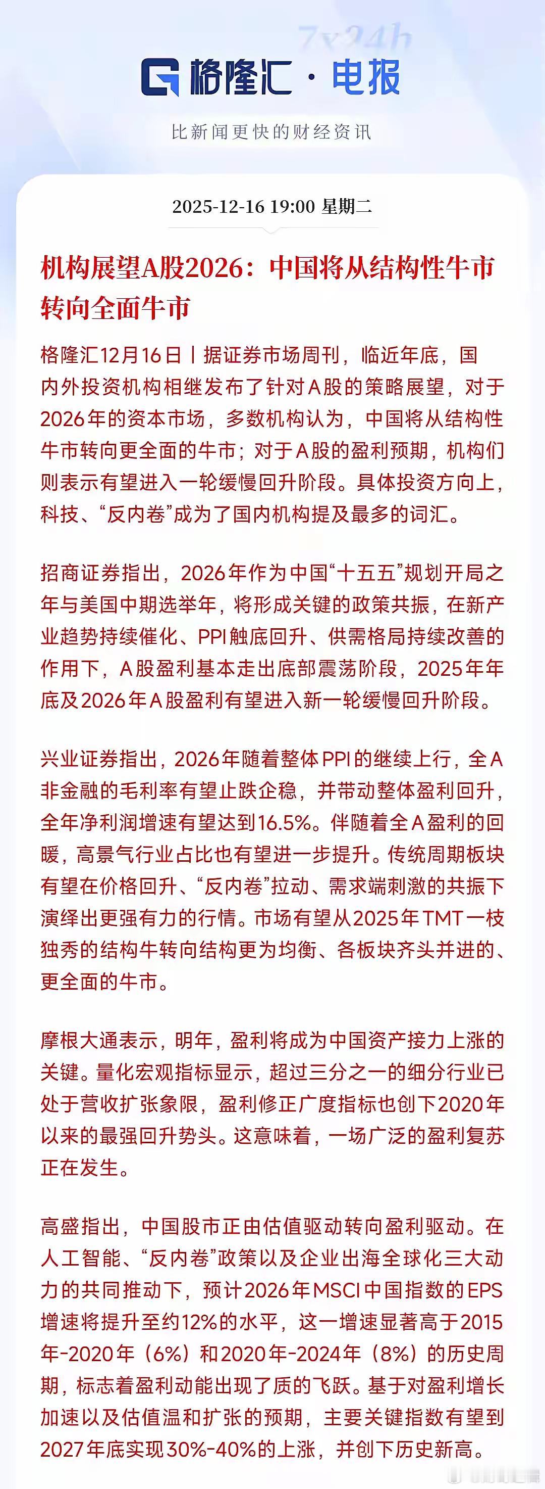 中外大机构联合指出:2026年A股将会转成全面牛市今年的牛市刚刚开始,但是只是结构性牛市,也可以说成科技股的牛市,赚钱的股民并不是很多。但兴业证券,招商证券,花旗,摩根这些大机构预测2026年中国A股将会来一波全面牛市,就是说大多数人都能赚到钱。主要就是看到了“十五五”规划,中国资产将转向盈利阶段,而且毛利率也有望止跌企稳。这次的预测不是空穴来风,主要就是明年才是中国资产的全面盈利的一年,很多行业将会盈利全面爆发,像“反内卷”的光伏,汽车等,成长性的人工智能,人形机器人等,老登行业的食品饮料等。