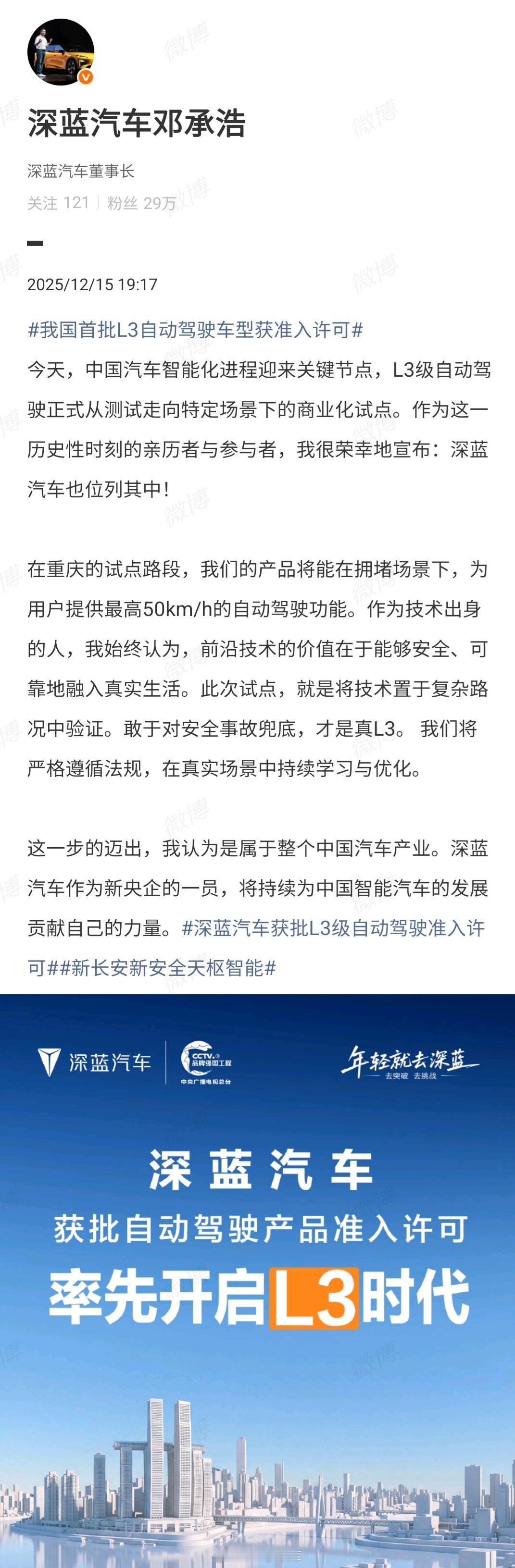 我国首批L3自动驾驶车型获准入许可深蓝汽车也获得了 L3 准入许可,可以在重庆的试点路段,在拥堵场景下,提供最高 50 km/h 的自动驾驶功能。42how新能源汽车
