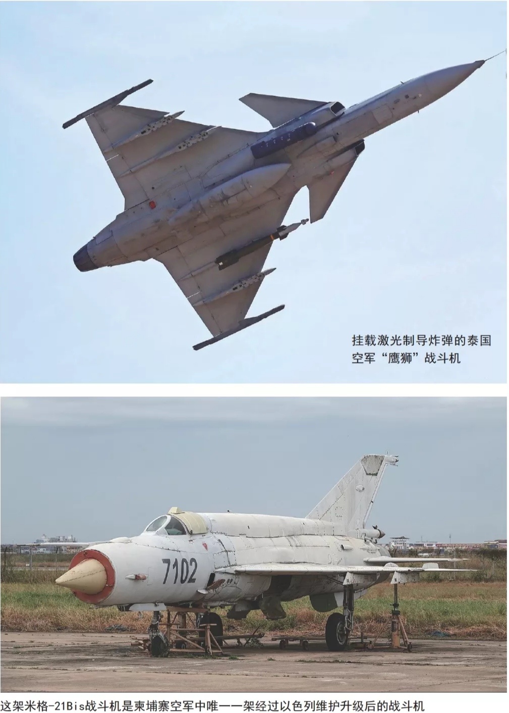 五日战争-泰柬边境冲突始末②空袭接踵而至 为了消灭柬埔寨的火箭炮发射阵地,泰国皇家空军先后出动了多架次F-16“战隼”战斗机投掷滑翔制导炸弹摧毁柬埔寨军队的指挥所、炮兵阵地,随后又动用了最先进的JAS-39C“鹰狮”战斗机参战,在完全掌握制空权的情况下可以毫无顾忌地展开对地攻击。 泰国空军拥有一支规模不小的F-16A/B“战隼”战斗机队伍,其来源比较繁杂,既有直接从美国公司购买的新机,也有从美军手中淘来的二手机,还有新加坡为了换取开放泰国乌多姆赛空军基地进行训练而赠送的战机,其中包括F-16 Block 15 OCU、Block15 ADF等型号。7月24日,泰国皇家空军就在离柬埔寨最近的乌汶叻差他尼空军基地部署了6架F-16战斗机以应对局势,这些战机多次出击,先后摧毁了柬军第8、第9步兵师指挥部和柬埔寨柏威夏、塔门通和富马丘地区附近的4个远程火力阵地。这些F-16挂载了加装有韩国KGGB精确制导滑翔套件的增程型制导炸弹,滑翔距离增至47~103千米,采用GPS+INS制导,打击精度小于25米,并具有盘旋攻击能力,不仅可以攻击暴露在地面的目标,还可以攻击位于山后坡的隐藏目标。7月26日,泰国皇家空军又出动2架次JAS-39C“鹰狮”战斗机使用GBU-12精确制导炸弹对普玛夸和塔门通寺区域附近的東军火力阵地发动空袭,这也是“鹰狮”战斗机实战首秀。2016年,泰国从瑞典接收了12架JAS-39C/D战斗机,其中1架坠毁,目前在役11架,今年6月又与瑞典萨博公司签署了新一轮合同,将采购12架JAS-39E/F战斗机。 泰国战机进出柬埔寨领空如入无人之境,主要原因是柬埔寨空军手中没有一架战斗机,并不具备作战能力。1986年,柬埔寨空军曾向苏联购买了22架二手的米格-21bis“鱼窝”战斗机和米格-21UM“蒙古人”战斗教练机,组建了701战斗机中队,驻扎在波仁通,但在缺乏备件和支持下,这些米格机在1992年6月17日最后一次飞行后就停飞了。1996年,柬埔寨空军与以色列飞机工业公司达成协议,由后者为12架米格-21Bis战斗机进行大修,后来又由于1997年柬埔寨国内政治危机导致世界银行中断资金援助,使得战斗机的大修工作停滞。此时,柬埔寨已经向以色列发货了4架米格机,到2000年2月才有一架米格-21bis战斗机(7102号)和一架米格-21UM战斗教练机(7114号)大修后返回柬埔寨,然而由于资金和飞行员缺乏,这两架战机很快又被封存,再也没有上天飞行过。当然,面对F-16和JAS-39战斗机,老式的米格-21bis战斗机即使升空作战也毫无胜算。 不过,泰国空军对柬埔寨的KS-1C中程地空导弹系统仍然有所顾及,其最大射程70千米,射高27000米,对泰国空军战机尤其是电子战能力较弱的F-16战斗机威胁较大,因此在未判明其阵地位置的情况下,泰国空军更多采用滑翔炸弹进行防区外打击,而不敢进一步深入柬埔寨境内。