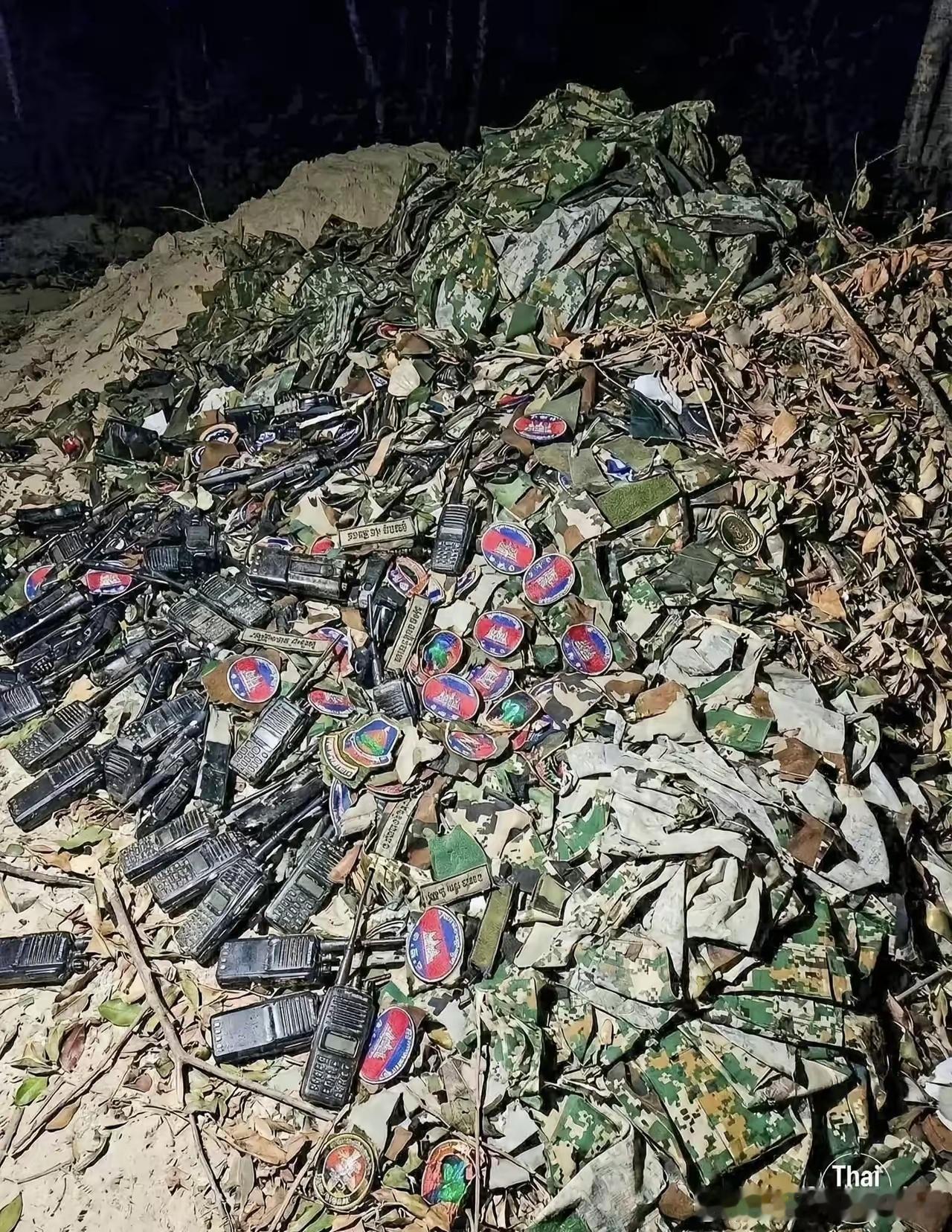 泰国军方发言人苏拉桑·孔西里少将表示,本轮泰柬冲突发生至今,泰国军队已经摧毁柬埔寨的赌场、电诈园区、人体器官移植中心等51个,还摧毁了柬埔寨军队10辆坦克、16门各型火炮以及其他大量武器装备,打死柬埔寨官兵至少221名。泰国方面的损失包括18名士兵阵亡和一名平民死亡。图为泰国军队在边境附近的一个柬埔寨电诈园区缴获的迷彩料、徽章和对讲机。