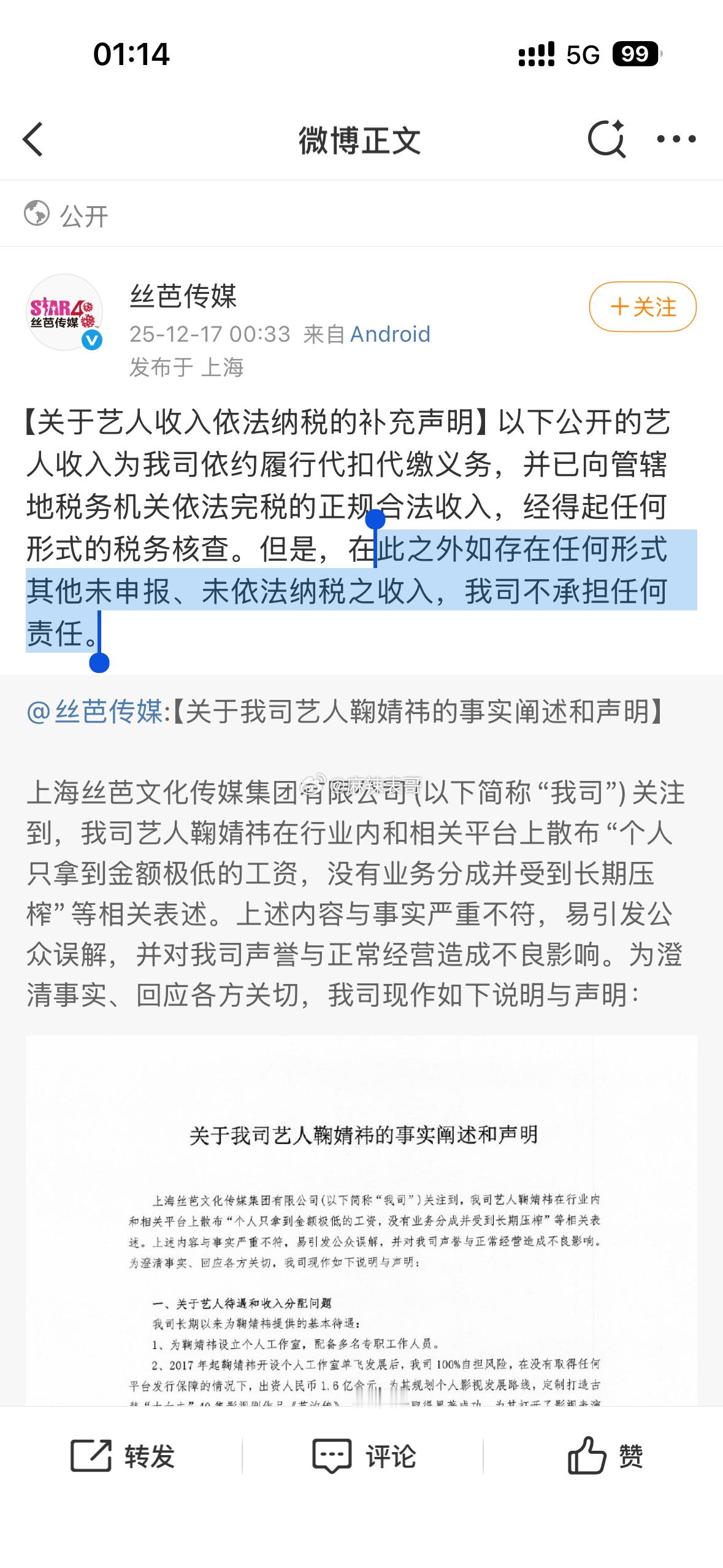 丝芭传媒阴阳鞠婧祎了,说给鞠婧祎的费用都合法纳税了,但「此之外如存在任何形式其他未申报、未依法纳税之收入,我司不承担任何责任」