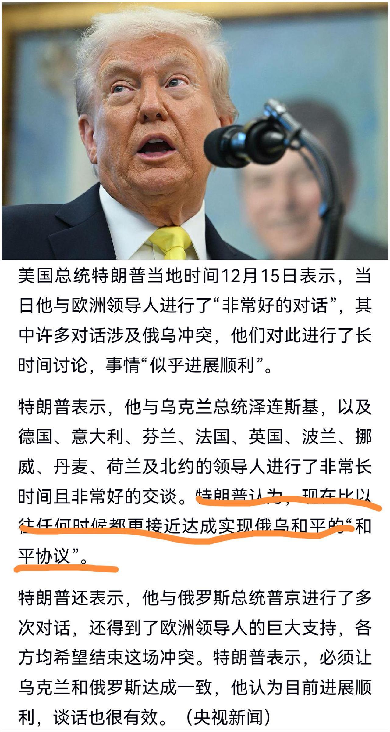 【恐怕这一次懂王又乐观过头了!】 懂王最近又表示:现在比以往任何时候都更接近俄乌达成“和平协议”了! 从各方面反馈的信息来看,乌克兰最关心的两个核心问题是安全和领土,安全问题似乎已经解决了,乌克兰不加入北约,但北约必须以其它方式保证乌克兰的安全。 但领土问题乌克兰一直没有松口,泽连斯基说没有哪一个乌克兰领导人敢在割让领土的协议上签字,要么就进行全民公投,但结果可想而知! 也许从懂王的角度来看,在他的软硬兼施下,问题已经解决了一半,还有一半也只是时间问题,但剩下的一半领土问题才是最硬的骨头,估计俄罗斯的底线是克里米亚维持现状和顿巴斯地区划入俄罗斯,和乌克兰的诉求根本不可能协调。 懂王提出在圣诞节前俄乌停火的要求大概率是可以实现,但俄乌签订和平协议恐怕还是遥遥无期。