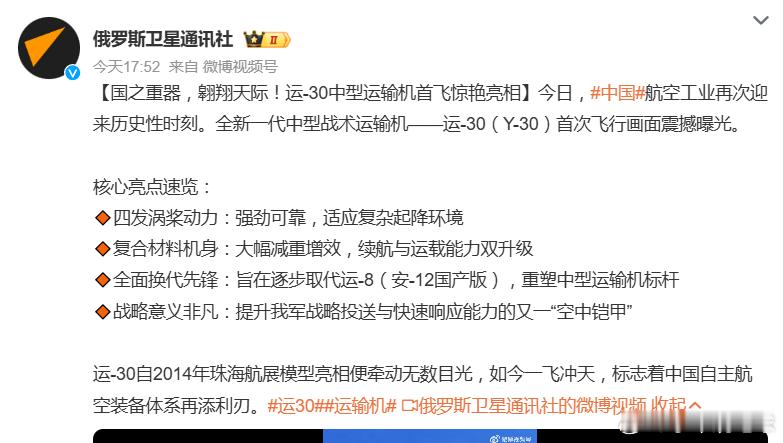 据俄通社称,Y-30今天完成首飞!今年年底新玩意是真多啊Y30首飞烽火问鼎计划 运30首飞