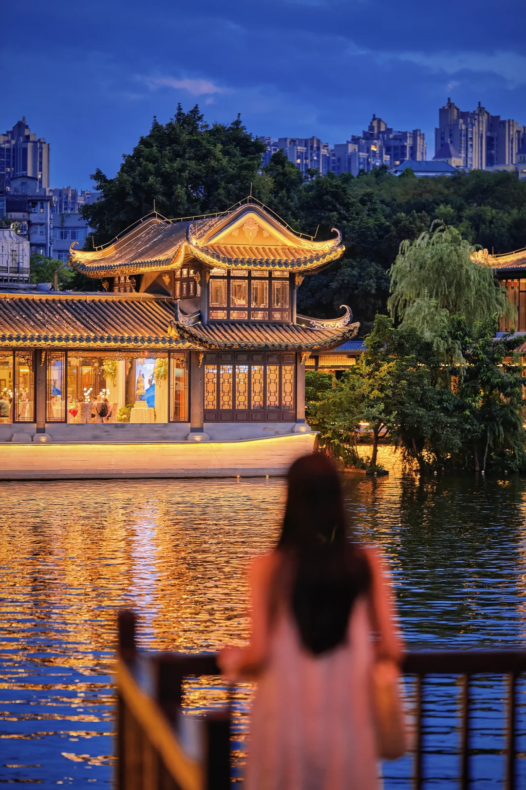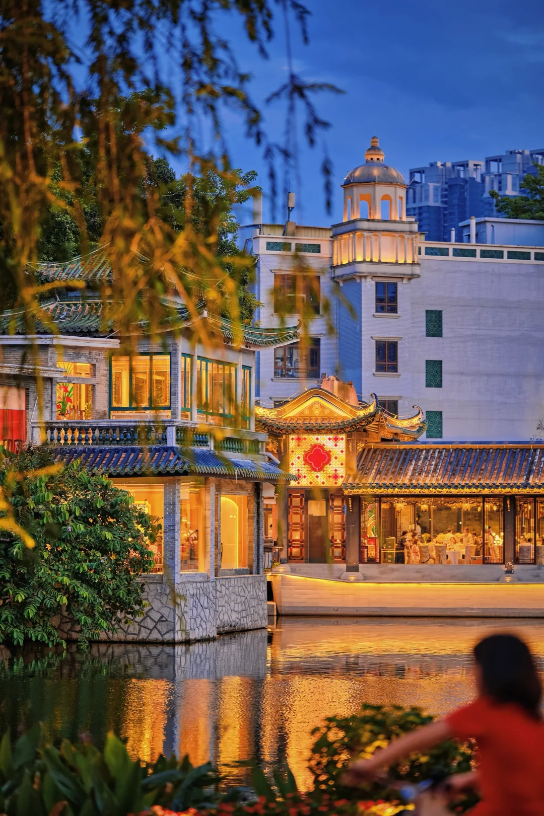 沿着湖边步道走,朱红的灯笼串从柳树梢垂到水面,岭南特色的亭台楼阁倒映在碧波里,摇橹船从桥洞划过的瞬间,像是把千年的岭南诗意都装进了镜头里