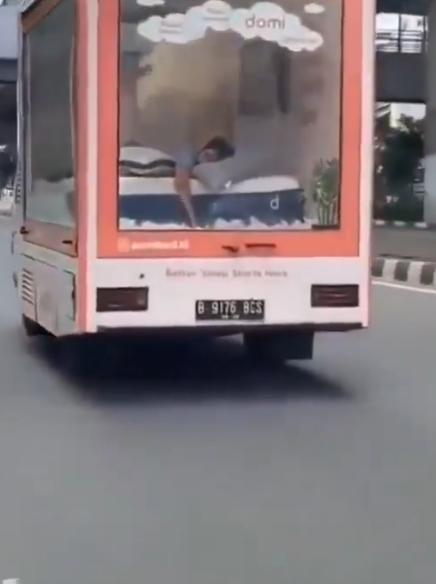 【梦想工作?有人竟然付钱让男人睡在行驶的汽车里。】这不是行为艺术表演,而是印尼某床垫品牌的广告宣传活动。其理念是,无论身在何处,你都可以在他们的床垫上获得良好的睡眠——即使是在行驶的汽车里。