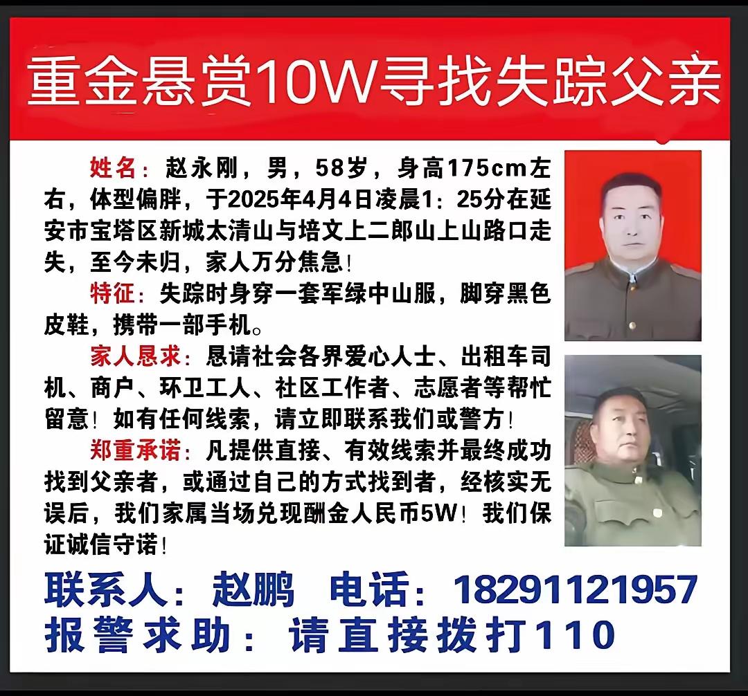 延安离奇失踪案:男子酒后“人间蒸发”240天,十万悬赏寻线索 延安58岁的赵永刚在一次老友聚餐后离奇失踪,至今240天杳无音讯。当晚,他喝了半斤白酒,借口上厕所却再也没回来。最奇怪的是,从不抽烟的他,聚餐时却连抽了五支烟,还一路步行八公里,最后消失在太清山监控盲区。警方和上千名搜救人员地毯式搜寻数月无果,悬赏金已从5万涨到10万。这起案件疑点重重,网友戏称:“难道是被山‘吃’了?”