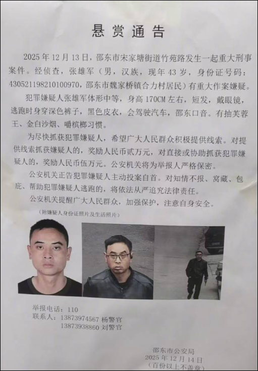 12月14日,湖南邵东警方发布悬赏通告称,重大刑事案件嫌疑人张某某13日犯案后潜逃。