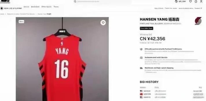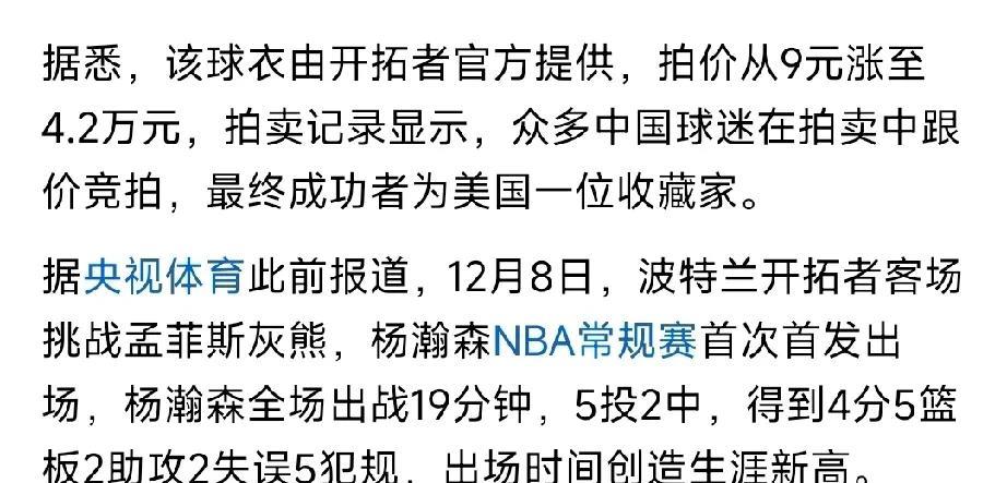 杨瀚森常规赛首发球衣拍卖4.2w,居然最后被美国收藏家买走! 杨瀚森的常规赛首次首发的球衣被开拓者官方拍卖,据悉,起拍价格为9元,很多中国球迷也参与竞赛,令人没想到的是最后竞拍成功的竟然是一位美国收藏家!最终价格42356元! 杨瀚森的首次首发数据,出场19分钟,拿下4分5篮板2助攻! 杨瀚森的商业价值从被开拓者选中就开始展现出来,球衣销量、球队受关注度,最终转化为收益,我想都是来自于杨瀚森的到来,杨瀚森在发展联盟打的不好不错,在发展联盟基本属于练级,感觉比CBA都还容易,所以如果开拓者真的想要培养杨瀚森,无论从商业价值还是球队发展来看,培养杨瀚森绝对是稳赚的!