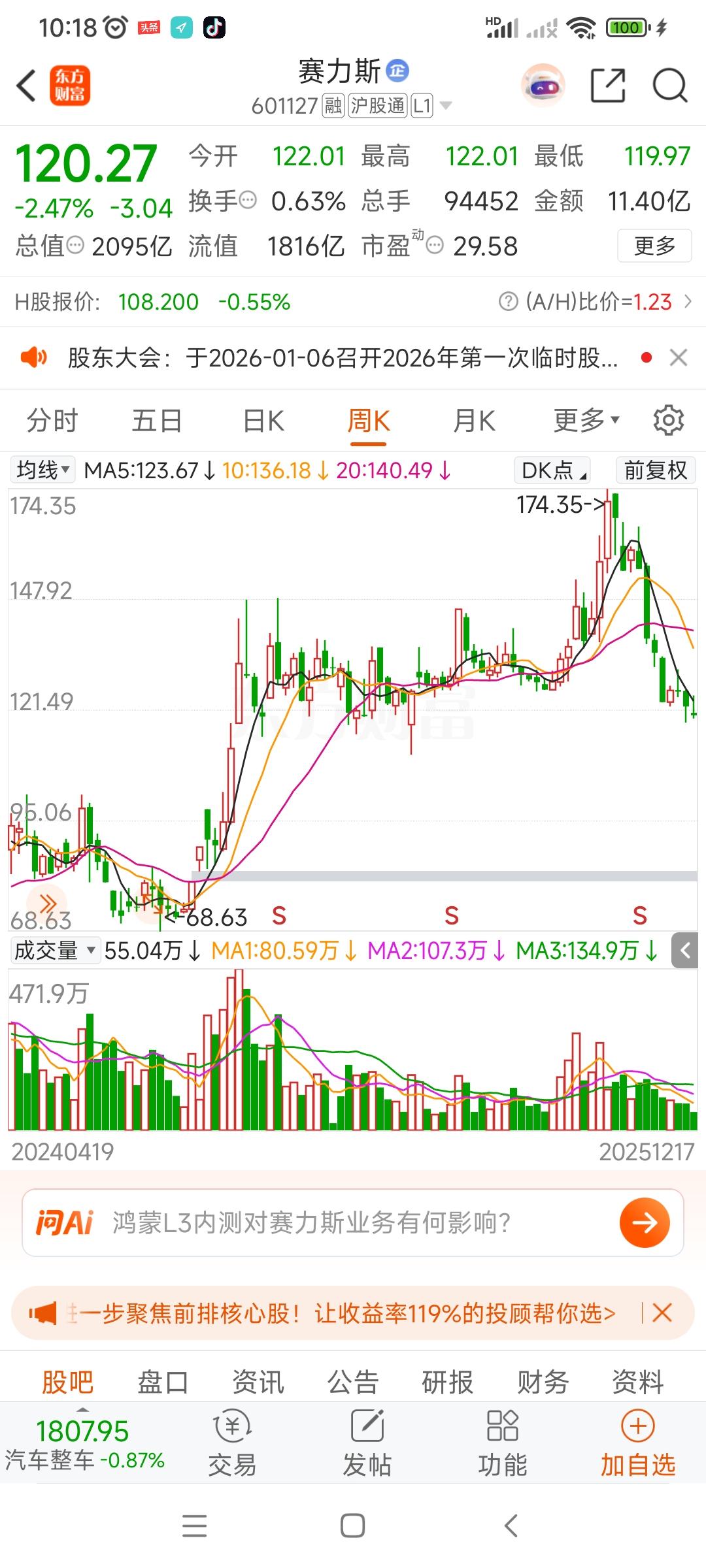 愁死了,实在太倒霉,一点希望都看不到。赛力斯今天的股票继续大跌,眼下都快跌三个点了,估计今天要跌破120了。自打买了赛力斯的股票,就没顺过,从最高175到现在不到120,天天往下跌,换谁心情能好? 买它就是因为看中了华为品牌,心想华为是世界第一大科技公司,L3智能驾驶也是世界第一,未来前景一片光明,况且还有中国14亿人做后盾,这股票怎么着也能涨到500吧,可现在这状况,真让人想不到,看不到一点希望。