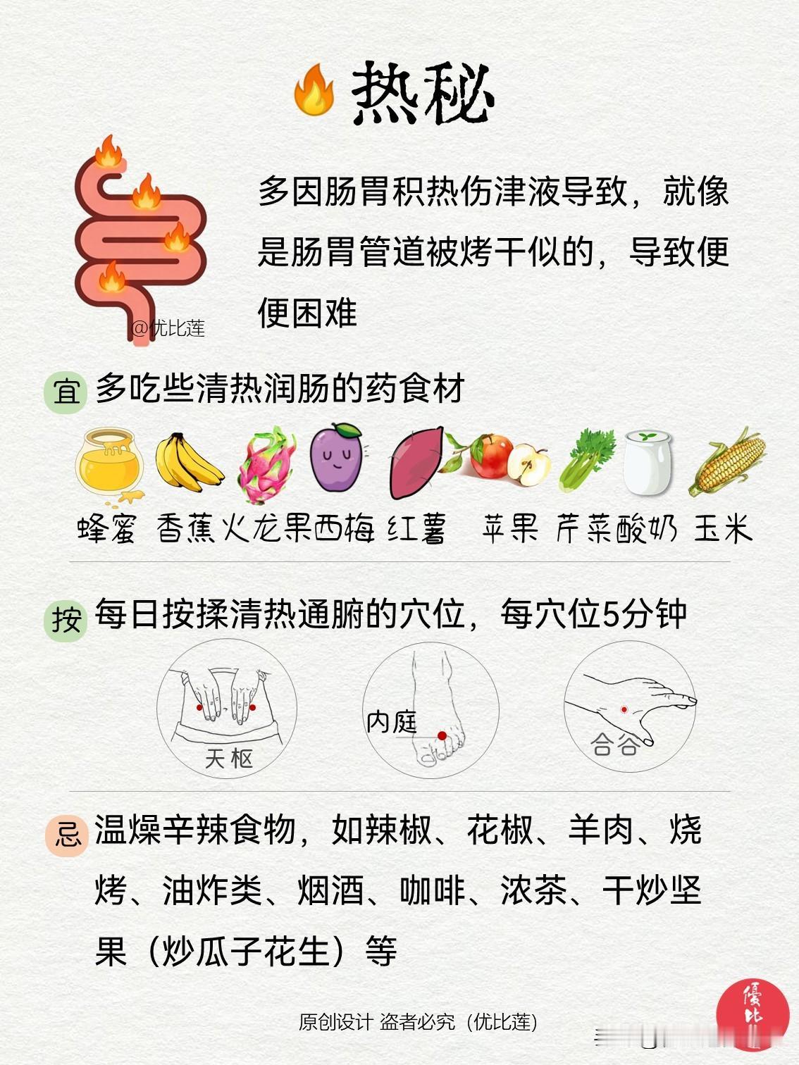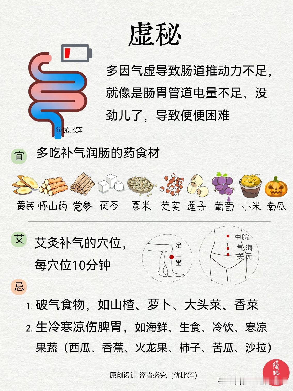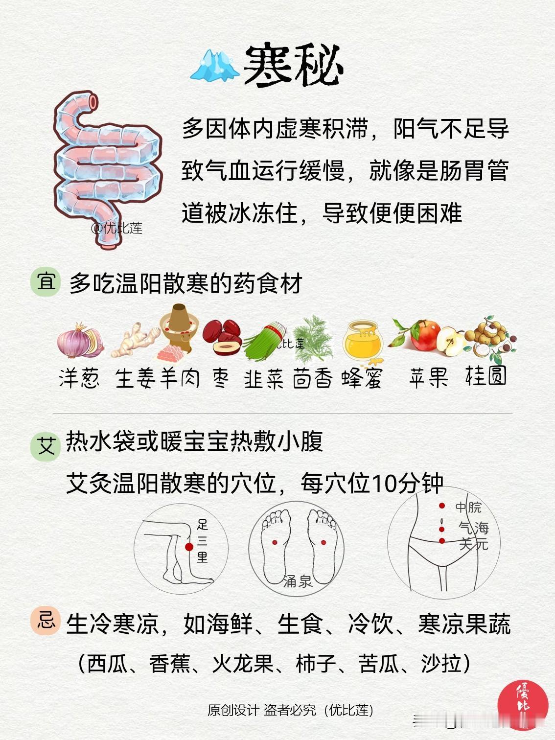 便秘还分3种?屎不同,催法不同! ①热秘: 证状:便便干燥结块、腹胀腹痛,烦躁、口干、口臭、尿黄、舌红舌苔黄 多因肠胃积热伤津液导致,就像是肠胃管道被烤干似的,导致便便困难 多吃些清热润肠的药食材,蜂蜜、香蕉、火龙果、西梅、红薯、苹果、芹菜、酸奶、玉米 每日按揉清热通腑的穴位,每穴位5分钟:天枢、内庭、合谷 忌温燥辛辣食物,如辣椒、花椒、羊肉、烧烤、油炸类、烟酒、咖啡、浓茶、干炒坚果(炒瓜子花生)等 ②寒秘: 证状:便便不干燥结块、凝滞难排、腹部冷痛、喜热怕冷、手脚发凉、尿尿清长、姨妈痛、舌淡苔白 多因体内虚寒积滞,阳气不足导致气血运行缓慢,就像是肠胃管道被冰冻住,导致便便困难 多吃温阳散寒的药食材,如洋葱、生姜、羊肉、枣、韭菜、茴香、蜂蜜、苹果、桂圆 热水袋或暖宝宝热敷小腹 艾灸温阳散寒的穴位,每穴位10分钟:足三里、涌泉、中脘、气海、关元 忌生冷寒凉,如海鲜、生食、冷饮、寒凉果蔬(西瓜、香蕉、火龙果、柿子、苦瓜、沙拉) ③虚秘: 证状:便便没劲儿、便后乏力、容易出汗、疲倦乏力、胸闷气短、舌头颜色淡白有齿痕 多因气虚导致肠道推动力不足,就像是肠胃管道电量不足,没劲儿了,导致便便困难 多吃补气润肠的药食材,如黄芪、怀山药、党参、茯苓、薏米、芡实、莲子、葡萄、小米、南瓜 艾灸补气的穴位,每穴位10分钟:足三里、涌泉、中脘、气海、关元 破气食物,如山楂、萝卜、大头菜、香菜 生冷寒凉伤脾胃,如海鲜、生食、冷饮、寒凉果蔬(西瓜、香蕉、火龙果、柿子、苦瓜、沙拉) 屎不同,催法不同!辨证调理,比埋头硬拉更重要~ 人生又何尝不是,选择往往大于努力