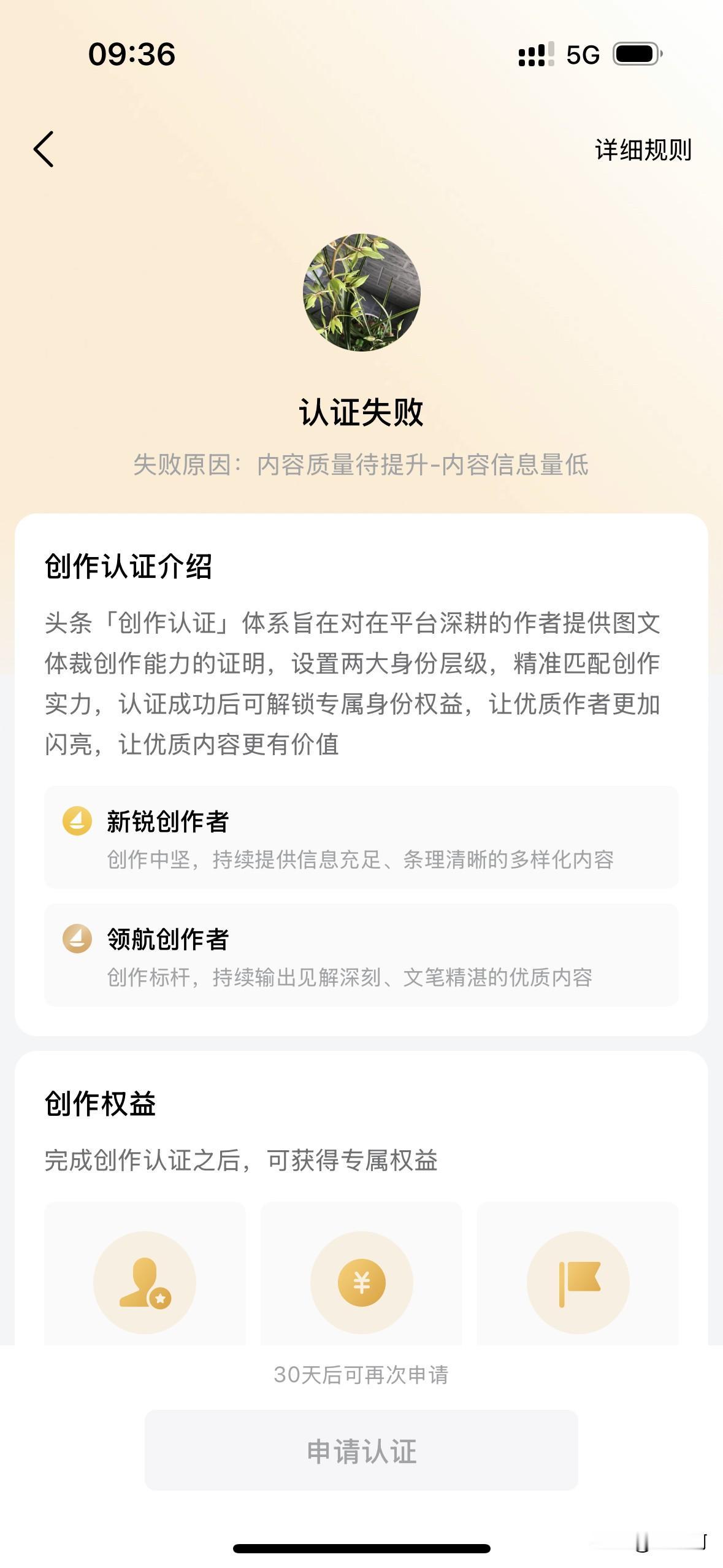 毫无意外,再一次的新锐创作者认证又失败了。每次都是同样的原因,内容质量待提升——内容信息量低。 既然如此,那先检查下自己写的内容吧。从进入头条以来,总共是发了400多篇作品,但中间我删除了不少没有阅读量的作品。留下来的我自认为写作文字水平的一般般,但信息量是有的。 再去看看素老三的文章,买个杏子、早上吃了个烤红薯、仅夏天买个空调就能写个七八篇,展现量每篇都高,我也是服气了。要是照着她的写,难道就有信息了? 不啰嗦了,也不报怨头条了,继续努力吧!