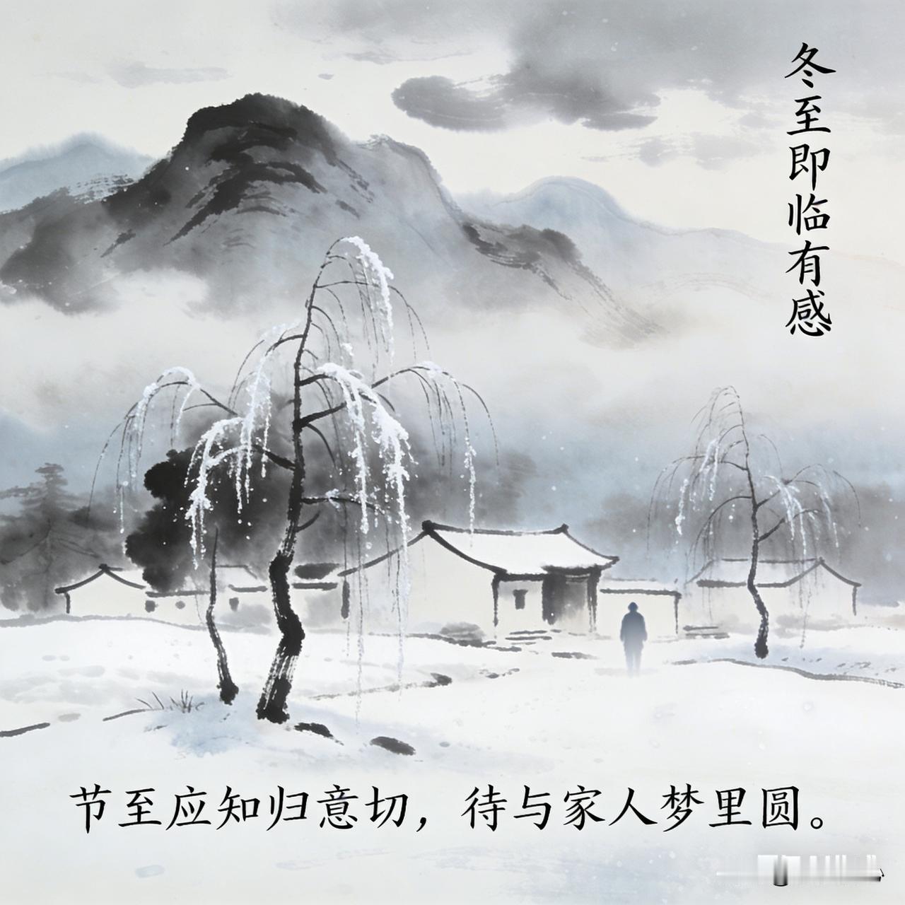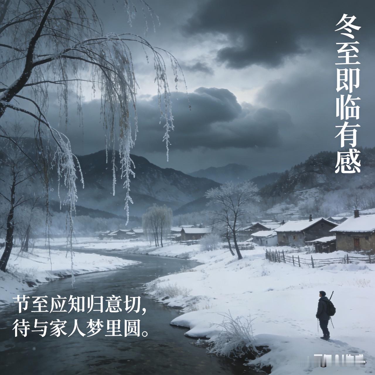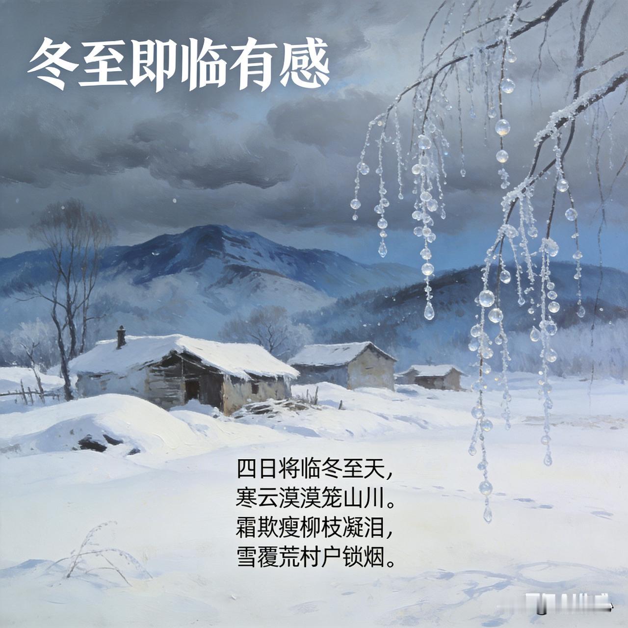 《冬至即临有感》乐韵诗心原创: 四日将临冬至天, 寒云漠漠笼山川。 霜欺瘦柳枝凝泪, 雪覆荒村户锁烟。 节至应知归意切, 时迁更觉岁华煎。 围炉且把乡思煮, 待与家人梦里圆。 这首七言诗词首句点明再过四天就到冬至节气,寒云笼罩山川,渲染出寒冷萧索氛围。描绘霜雪侵袭下柳与荒村之景,增添凄凉。次句由节气引发归乡之意和对时光流逝的感慨。尾句写围炉煮乡思,期望能与家人在梦里团圆,将思乡之情推向高潮。