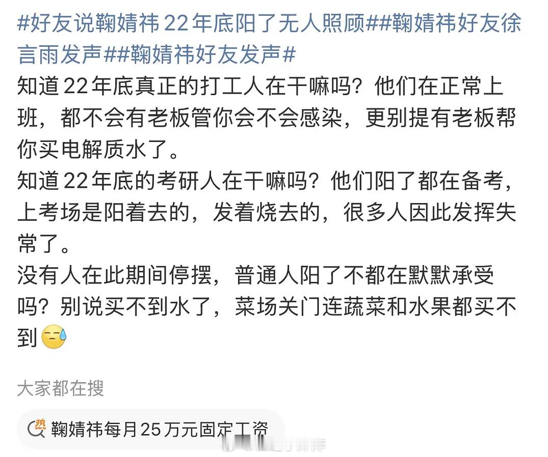 徐言雨是没上过班么,属实是猪队友发言了热知识《打过工的人都知道,老板不管买电解质水》先不说普通打工人22年都扛着病去工作公司给她豪宅豪车+司机都配上了她也有私人助理怎么阳了没喝上电解质水还值得发个微博生病不是非要喝电解质水的,都没有生活常识吗鞠婧祎前队友徐言雨发声鞠婧祎每月25万元固定工资芸汐传 1.6亿鞠婧祎宣布已是独立艺人丝芭说鞠婧祎经常报销和工作无关的支出