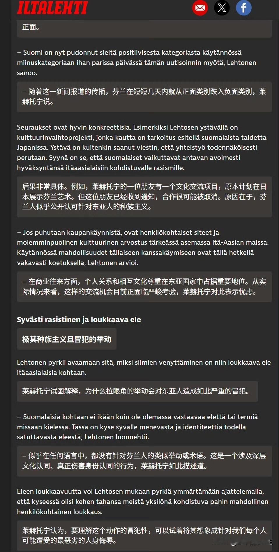 韩国人帮芬兰人找到了“祖宗”,以后芬兰人再拉眼角真的要想想是不是在侮辱自己。 韩国《朝鲜日报》报道,历史上芬兰人被西欧种族理论家根据高颧骨等特征,将芬兰人标记为“在欧洲居住的蒙古人”。,并视其为白人社会中的次等族群。 芬兰这群被西欧歧视的人,居然用眯眯眼嘲讽亚洲人,不知道他们的祖先心里怎么想。就像芬兰赫尔辛基大学教授莱赫托宁说的,芬兰人无法理解,这场言论引发的风波有多么重大和严重,我们的正面国家形象就这样支离破碎了。 芬兰人在传统欧洲眼里本来就是异类,不知道有些芬兰人现在变得如此厌恶,他们自觉也高人一等,没想到自己本来就是被人家嘲讽的对象。
