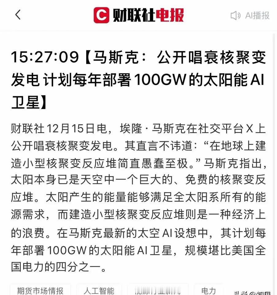 把这两个新闻放在一起看,就会发现,其实华尔街的钱是最好骗的。只要你画的饼足够大,足够吸引人,不管你最后能不能实现,但是钱一定能实现。 马斯克公开唱衰核聚变发电计划,那是因为他要推他的太阳能AI卫星。 虽然SPACE-X没有能将人送上火星,甚至没有能将人送上月球,甚至星舰都还没有成功……但是他在做啊,让华尔街看到希望,所以它就能有8000亿美元的估值,能为马斯克带来3360亿美元的资产。 所以这个世界归根到底还是要敢想和会吹。[偷笑] 点右上角关注我,我们一起去看这个魔幻的世界