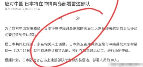 最近有消息说,日本要在冲绳附近一个叫北大东岛的地方装雷达。这雷达是移动式的,预计明年春天能用上,说是用来盯着咱们海军的一举一动。 这事发生在12月16号被外媒曝光,刚好咱们之前警告过日本别搞事,但他们就是不听。其实早在去年,咱们用雷达照射过日本军机后,他们就开始紧张了。 有分析说日本这么干,背后美国肯定是点头了。毕竟现在中日实力差距越来越大,日本光靠自己肯定撑不住。但是他们可能还不知道,要是继续这么硬碰硬,最后吃亏的还是自己。 现在看,日本可能是想通过军事动作牵制咱们,但这样下去双方矛盾肯定会加剧。到底后面会怎么发展,就只能等等看了。