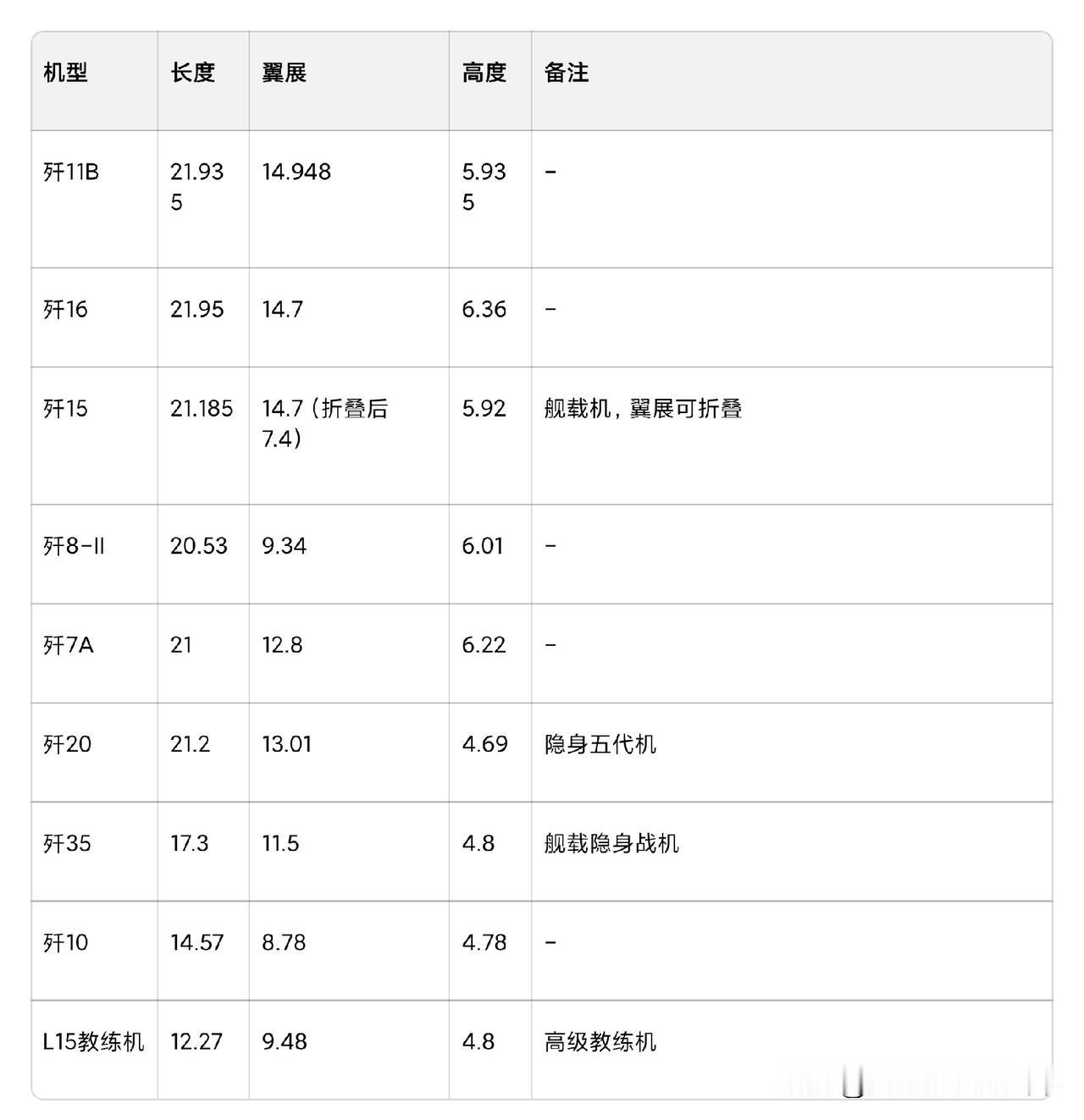 各类型歼击机到底多大?用篮球场做比较看清大小! 歼11B和歼16身长都超21米,翼展接近15米,妥妥的重型战机,大身板能装更多燃油弹药,不管是远程制空还是对地都是首选; 歼15作为舰载机,身长21米出头,翼展14.7米,折叠后直接缩到7.4米,完美适配航母甲板的寸土寸金。 歼8-II和歼7A体型也不算小,身长都突破20米,翼展却有明显差别,这和它们侧重高空高速的作战定位直接挂钩。 隐身战机里,歼20身长21.2米,兼顾超音速巡航和远程作战需求,歼35身长17.3米,紧凑体型更适合在航母上灵活调度。 歼10身长14米多,翼展不到9米,小巧灵活的特质让它在近距离缠斗中优势明显。 L15教练机作为高级教练机,身长12米出头,翼展9米多,专为培养飞行员设计,体型刚好适配教学训练需求。