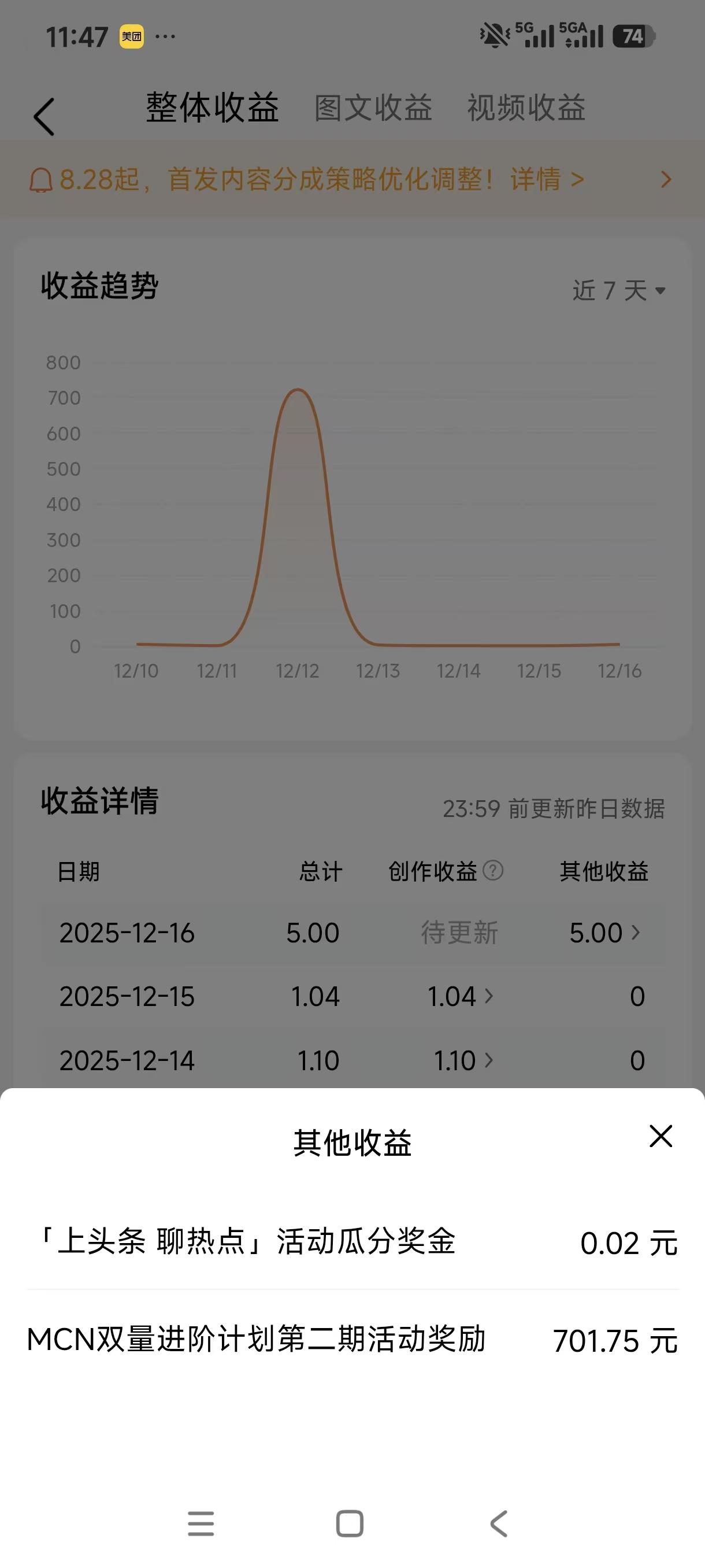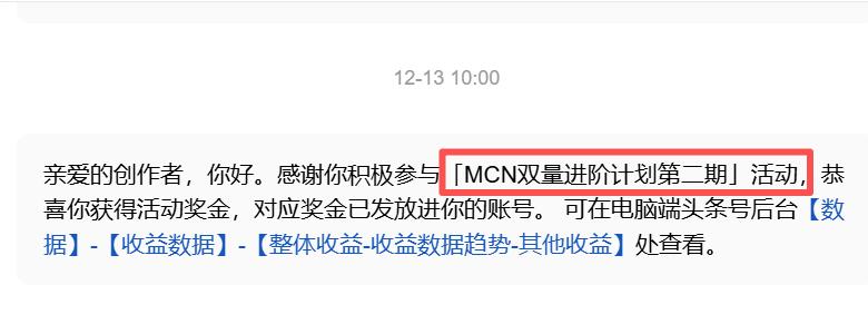 平台撒钱了!你知道如何调动创造者的心情的吗?‘一惊一乍’就是平时天天给你1元1毛的,无意加入一个活动,过几天发现给了这么多钱,直接超预期惊喜! 亲爱的创作者,你好。感谢你积极参与[MCN双量进阶计划第二期」活动,喜你获得活动奖金,对应奖金已发放进你的账号。可在电脑端头条号后台【数据】-【收益数据】-【整体收益-收益数据趋势-其他收益】处查看。我看到这个信息,本能的以为就是几毛钱,因为之前都是几毛钱,所以我就没有合计,直到今天我无意看到一个收益波浪图,一看晕死700元,我惊呆了,点击一看哦原来是参加平台活动的收益,这直接惊呆了! 所以创作者要贵在坚持,持之以恒,绝不能三天打鱼两天晒网,努力去付出,自然有平台对你的支持,所以感谢平台对创造者的支持,也是可以补贴家用的,毕竟目前赚钱难的时候,平台每一次给创造者撒钱,都是在鼓励创造者继续创作更好的作品,于国家、于人民、于自己都是有意义的事情,感谢平台给予的现金激励!