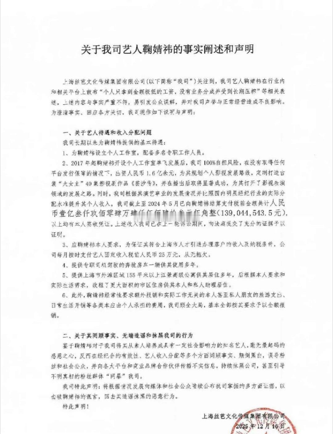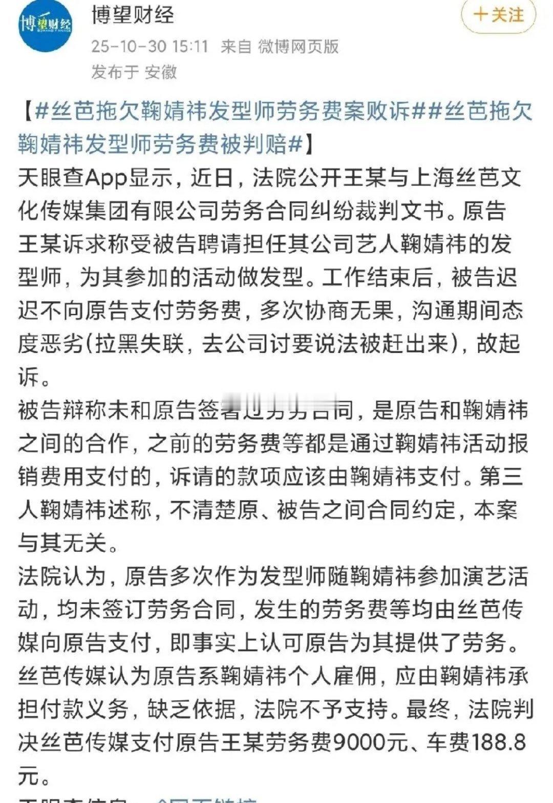 从这件事谁看完不得说丝芭是真够抠的啊!鞠婧祎去参加活动,请的造型师要9000块造型费,公司居然不肯出,还让造型师去找鞠婧祎要,说这是造型师和她个人的合作,跟公司没关系。结果鞠婧祎一脸懵,说自己根本不知道造型师和公司咋约定的,这钱哪能她出啊!最后造型师把这事告到法院,判决结果出来了——这笔钱得丝芭公司付,跟鞠婧祎半毛钱关系没有。这事儿一出,直接打了丝芭的脸!之前还说从没亏待过鞠婧祎,真没亏待的话,连9000块造型费都舍不得掏?还想让艺人自己扛?明星跟公司签约,不就是图公司能规划事业、揽下工作开销吗?艺人赚的钱,公司分走一大块,结果该花的钱却缩手缩脚,这算哪门子不亏待啊!