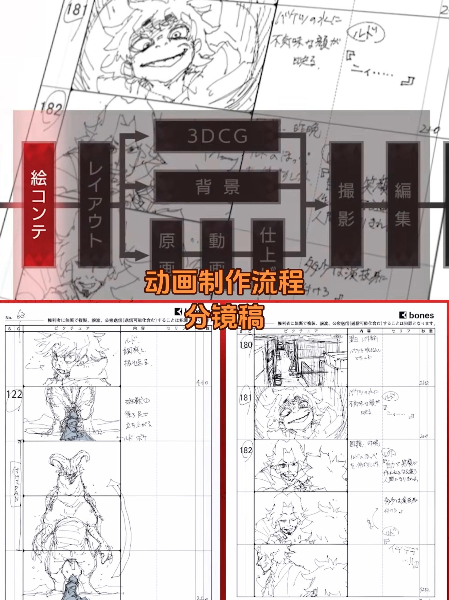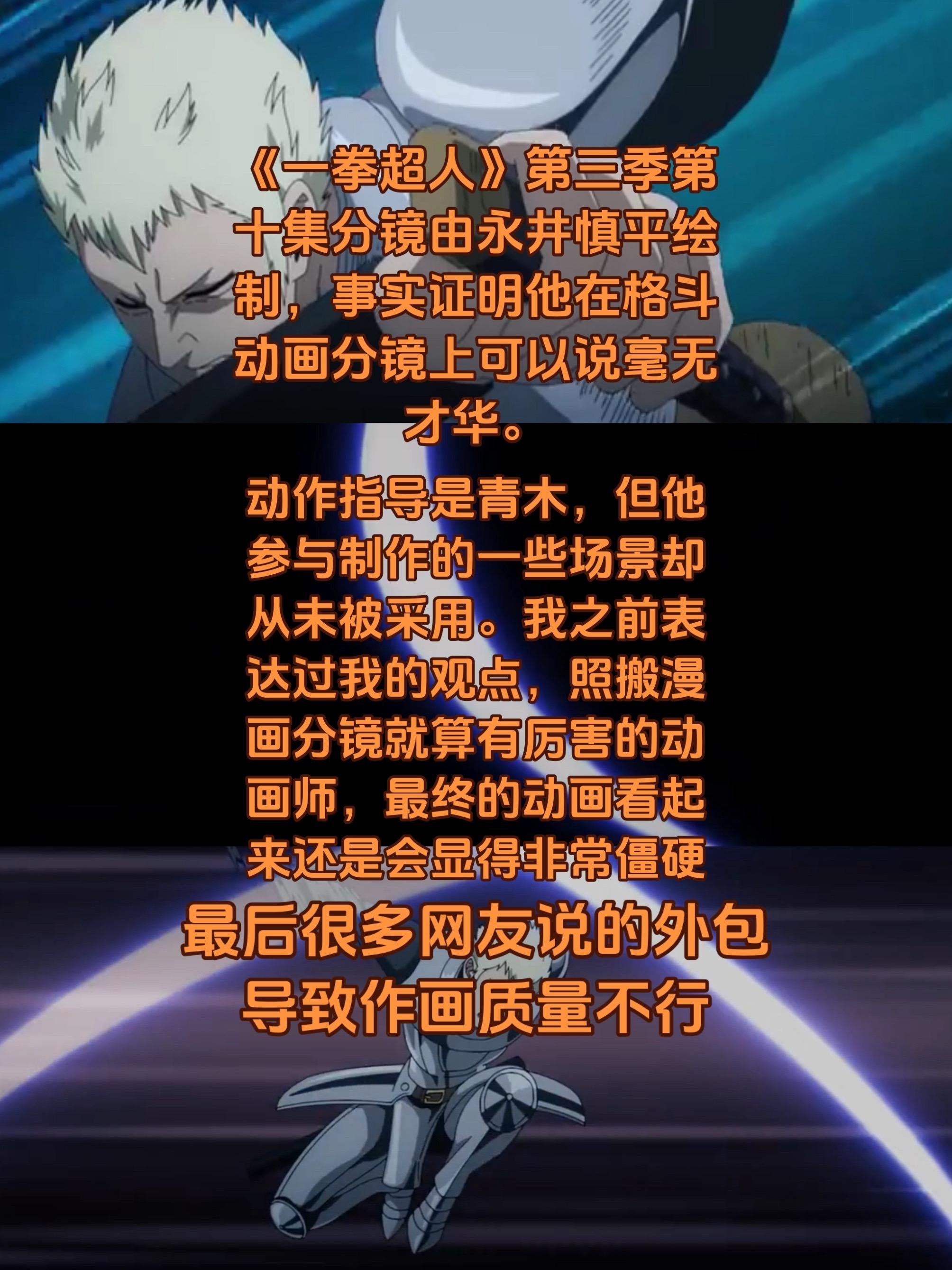 《一拳超人》第三季第十集分镜。由永井慎平绘制,事实证明他在格斗动画分镜上可以说毫无才华。动作指导是青木,但他参与制作的一些场景却从未被采用。我之前表达过我的观点,照搬漫画分镜就算有厉害的动画师,最终的动画看起来还是会显得非常僵硬,最后很多网友说的外包导致作画质量不行