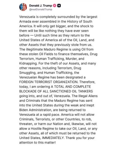特朗普再创历史:宣布委内瑞拉政府为恐怖组织 近日特朗普宣布委内瑞拉领导层为外国恐怖组织,并宣布全面封锁所有受制裁的油轮,以“归还被盗资产”。 此前美国从未宣布一个国政府设为恐怖组织,特朗普这次开了先例。另外由于美国规定不与恐怖分子谈判,这意味着特朗普放弃了与委内瑞拉争端的外交解决途径。 此举正值美国在加勒比海海军力扩充以及特朗普威胁将在委内瑞拉境内对所谓“毒品恐怖分子”发动打击之际。 自九月以来,特朗普派出美国军舰围堵委内瑞拉,理由是打击贩毒。美国军方已经击毁了20多艘美方指称的“贩毒船”,杀害了80多人。 委内瑞拉否认参与毒品走私,称此次袭击是“殖民主义”计划的一部分,旨在推翻总统尼古拉斯·马杜罗,掠夺国家自然资源。 然而特朗普至今并没有提供任何证据,甚至放弃抓捕罪犯,对所谓的贩毒船只的船员全部杀死。 有意思的是,除了美国国内反对派指责特朗普滥用权力外,俄罗斯、部分南美国家外,欧洲国家对特朗普的作为就好像没看见一样,鸦雀无声。 国内除了央视,其他媒体、大V也很少指责特朗普的作为,甚至质疑声音都没有。