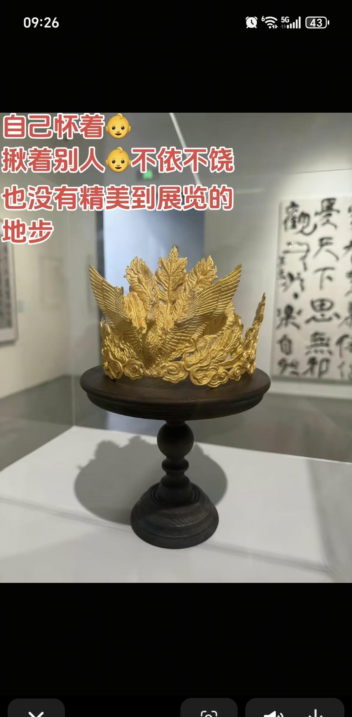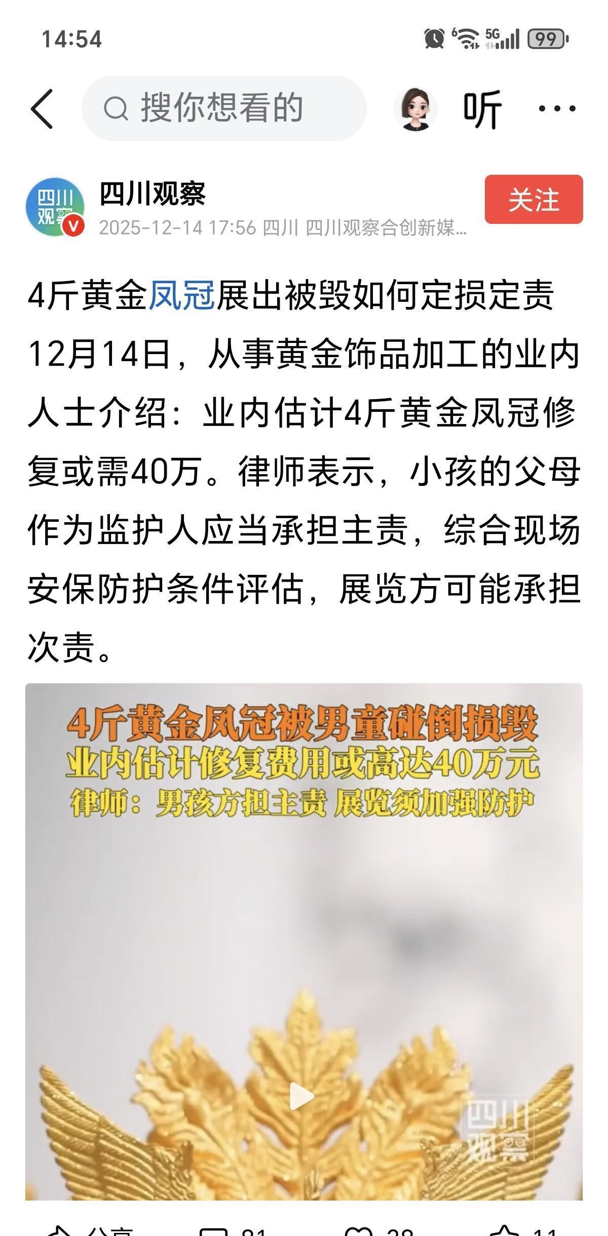 这事情还挺离谱!千万粉丝博主称自己4斤重亲自打重的凤冠被小孩破坏了!修复需要40万,这个凤冠做工不精致,背后更是一塌糊涂,准确来说挺丑的。 事件发生在博主自家策划的小型展览上,监控画面显示,一个小男孩凑近展台时,凤冠突然从亚克力罩里滑落,金属翅膀磕在木质台面上,发出沉闷的响声。 博主夫妇在后续视频里,对着镜头反复摩挲变形的凤冠边缘,丈夫突然开口:“这不仅仅是个物件,这是我们婚姻的见证——现在它裂了,就像预兆着什么。” 评论区很快炸了锅。有网友放大视频截图发现,那个亚克力罩子轻飘飘地扣在展台上,既没粘牢也没加装护栏,凤冠底座与罩子间甚至能塞进一根手指。 更有人扒出博主此前晒出的“制作花絮”:所谓“亲自打造”,更像是把3D打印的半成品稍作打磨——翅膀上的羽毛纹理僵硬,连接缝处的毛刺都没处理干净。 一个号称“倾注心血”的爱情信物,为何连最基础的展陈防护都懒得做? 小男孩的家长很快联系博主,表示愿意承担合理维修费,但希望先找第三方机构评估损坏程度。 可博主显然没耐心等。视频里,她对着镜头抹眼泪:“不是钱的事,是晦气!我现在一想到这事就肚子发紧——我还怀着孕啊!” 这话让不少妈妈粉坐不住了:“怀着孕更该知道,一个孩子面对全网指责时,可能比你肚子发紧更难受。” 有从事文物修复的网友算了笔账:即便凤冠含4斤纯金,变形矫正加抛光的人工费顶天不过两万,40万的报价单里,到底有多少是“情感损失费”? 另一种声音开始出现:或许博主真的心疼这件“信物”,但公开把孩子的无心之失上升到“婚姻劫难”,更像是在用悲情叙事收割流量——毕竟,视频发布后,她的直播观看人数暴涨了三倍。 比起讨论凤冠值不值40万,更该追问的是:当个人展览越来越多,那些摆在台面上的“宝贝”,到底该先考虑防摔,还是先考虑怎么讲故事? 监控里,小男孩被妈妈拉走时还回头望了一眼倒地的凤冠,小手紧紧攥着衣角。 那个瞬间突然让人明白:比起“婚姻的坎”,或许“如何教会孩子面对意外”,才是更重要的人生课题。 而对于屏幕前的我们来说,下次再刷到“天价修复费”的新闻时,不妨先看看:那个号称“无价”的物件,到底是被孩子碰倒的,还是被流量吹倒的。