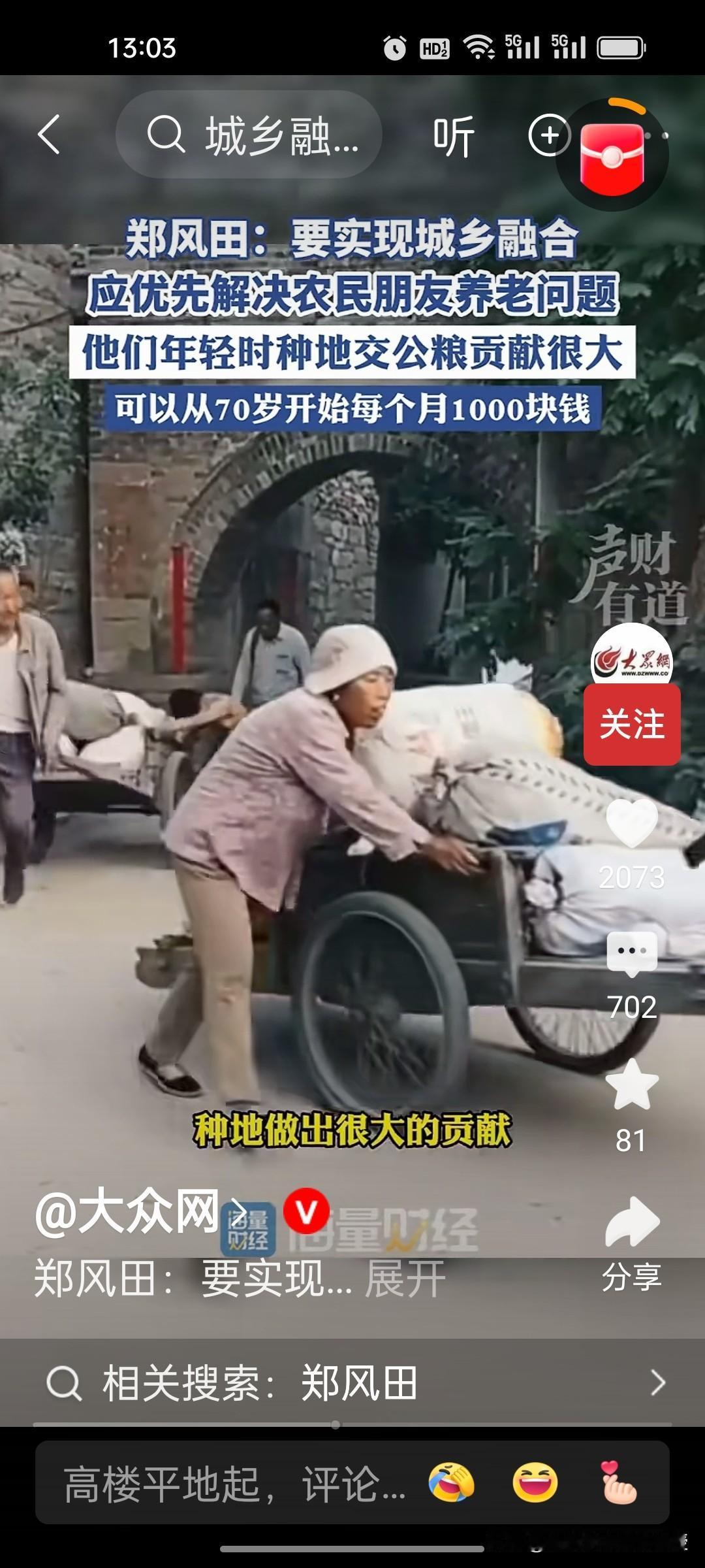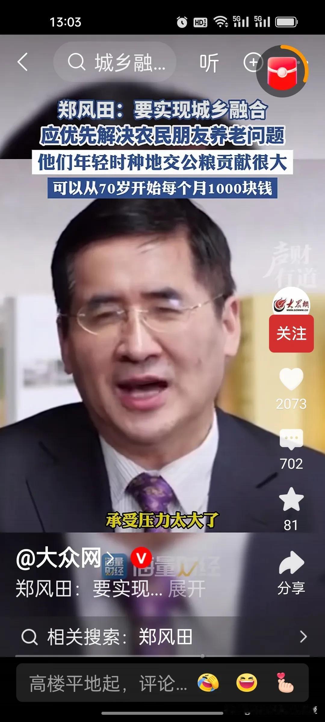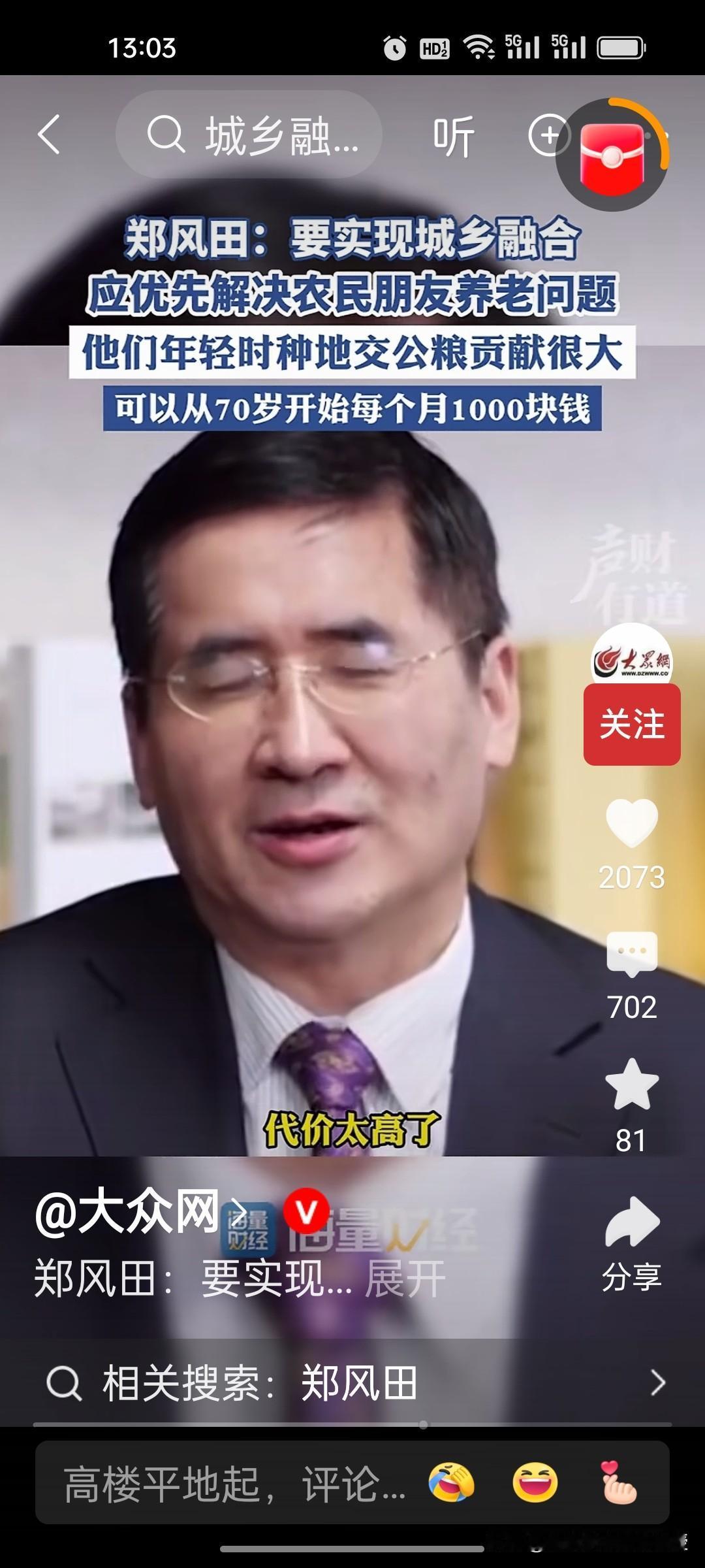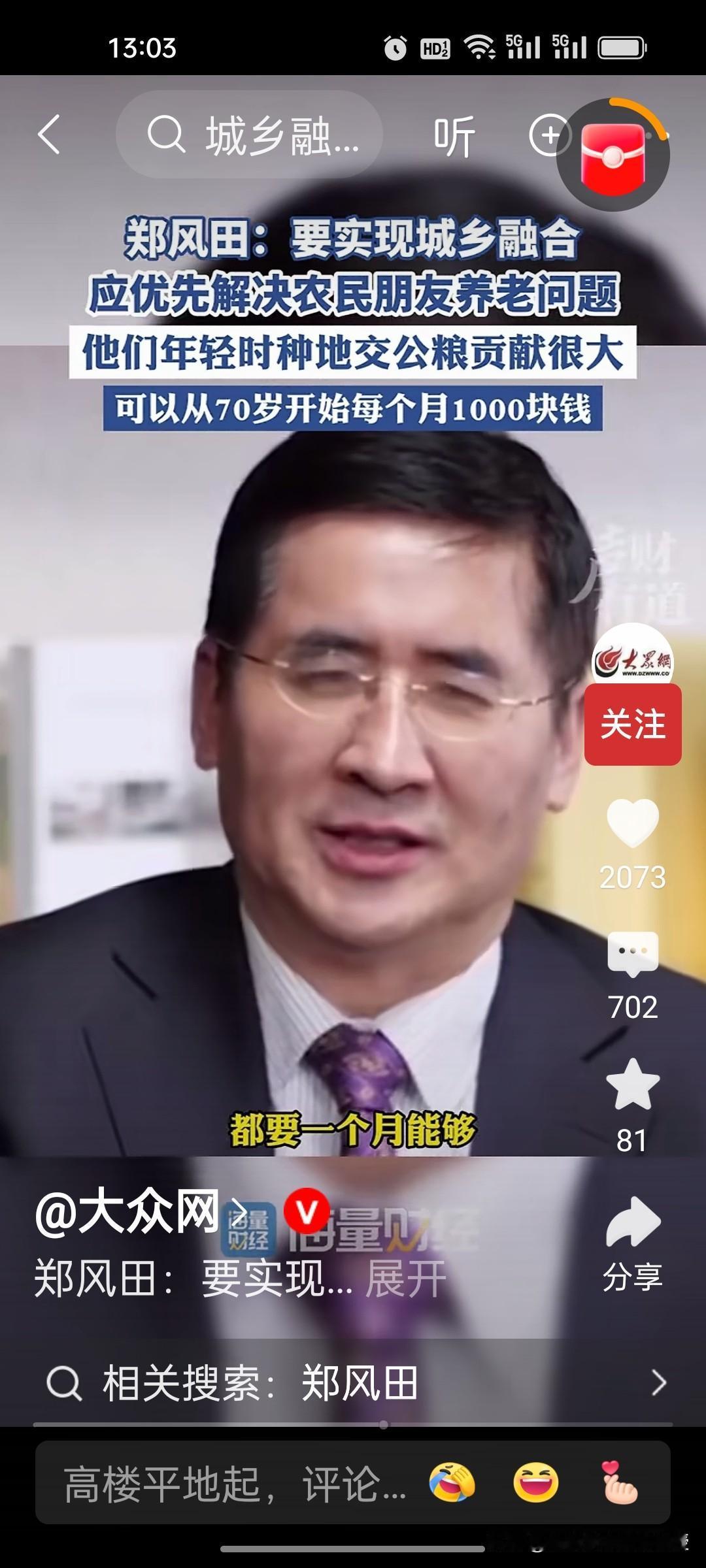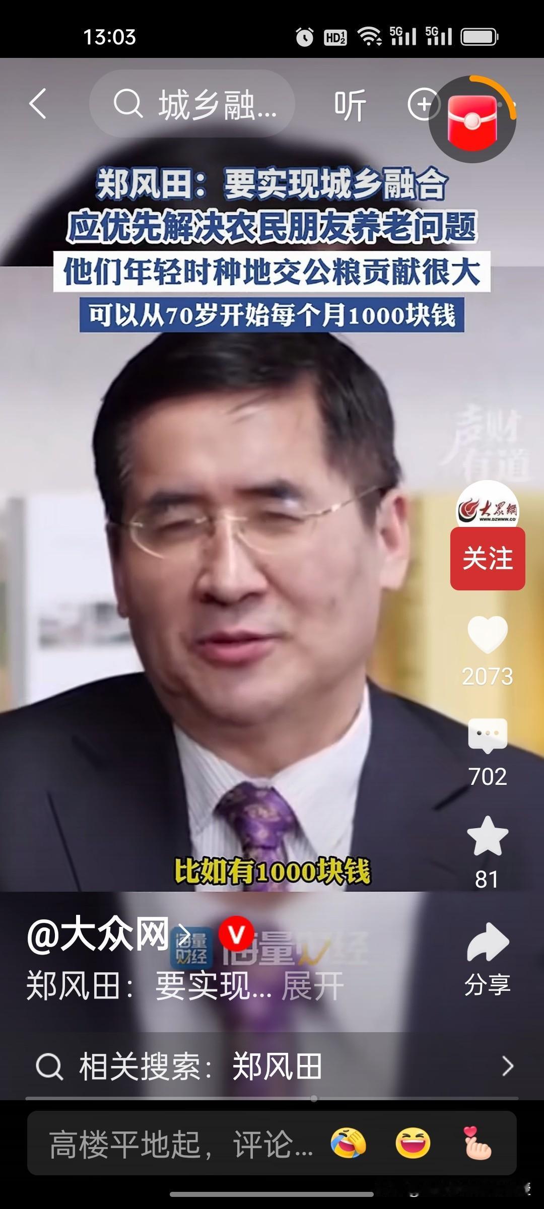 人大教授郑风田建议要给70岁以上农村老年人每月发1000元,解决农民养老问题,以此来实现城乡融合。因为他们年轻时交公粮对国家的贡献很大,有一些专家说从60岁开始给他们发养老金,可能承担的压力太大。因此,郑教授认为从70岁开始给农民发养老金,让他们享受到有尊严的养老待遇。 目前中国70岁以上农村老年人合计约4529.81万,这些老年人的年收入中位数仅6000元左右,平均一个月只有500块,增加农村老人的收入,提高他们的消费能力,也是扩大内需,提振消费的重要举措。