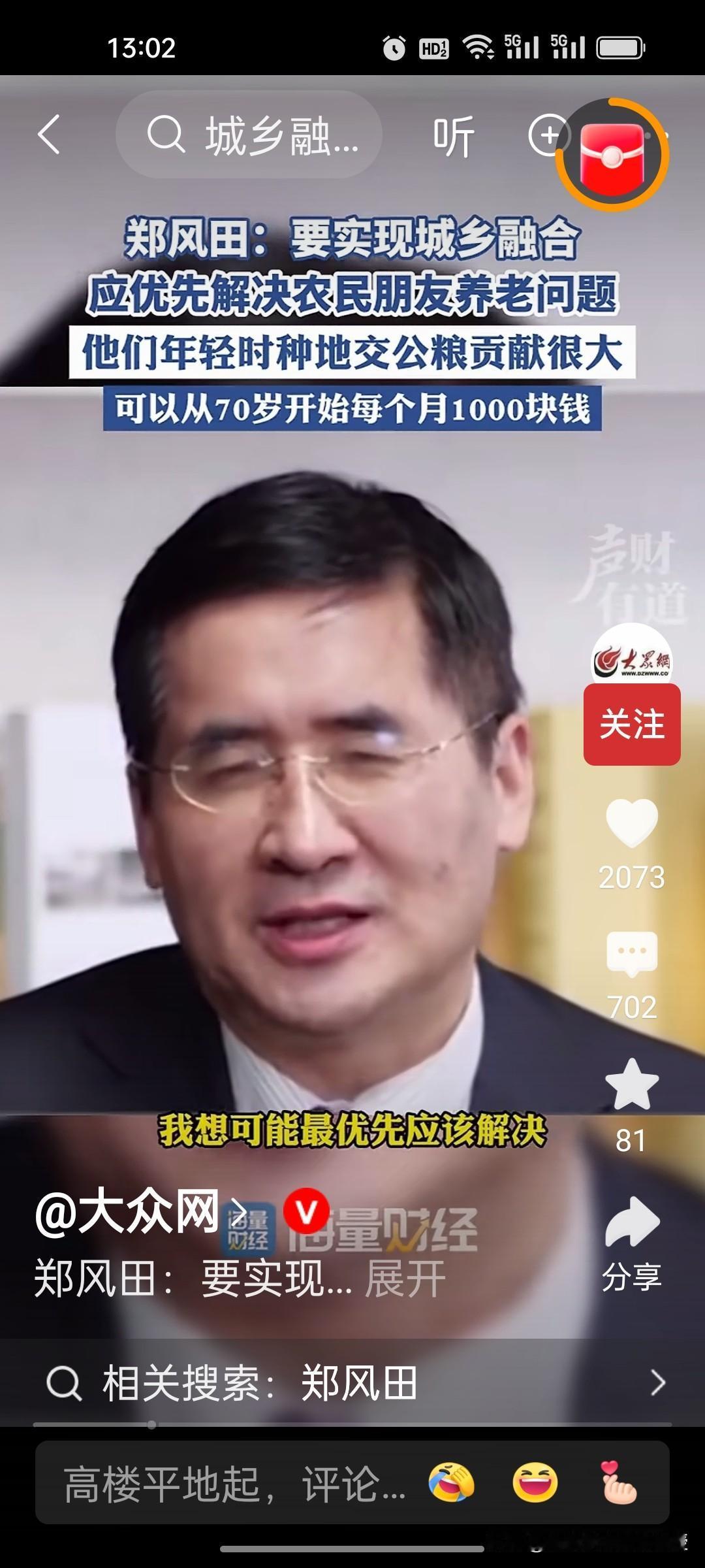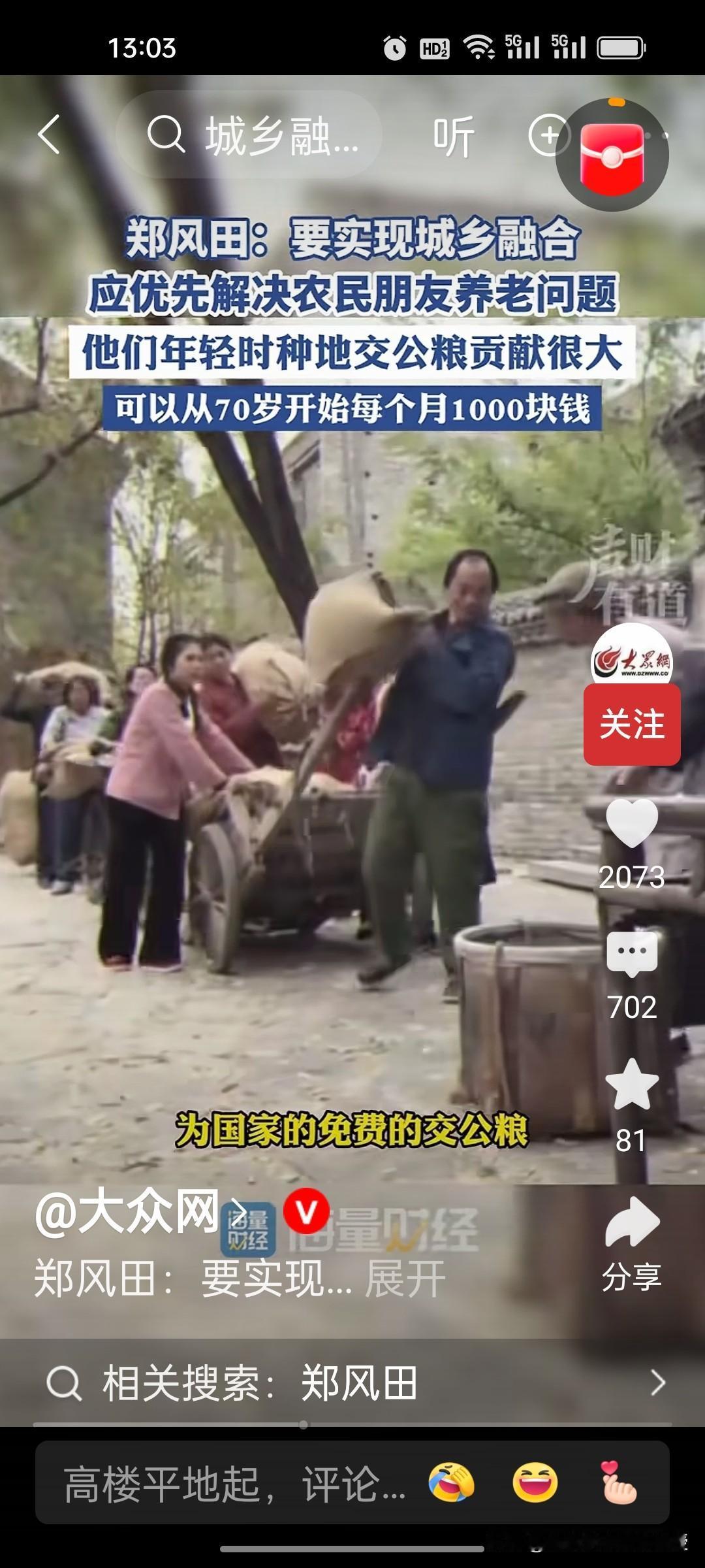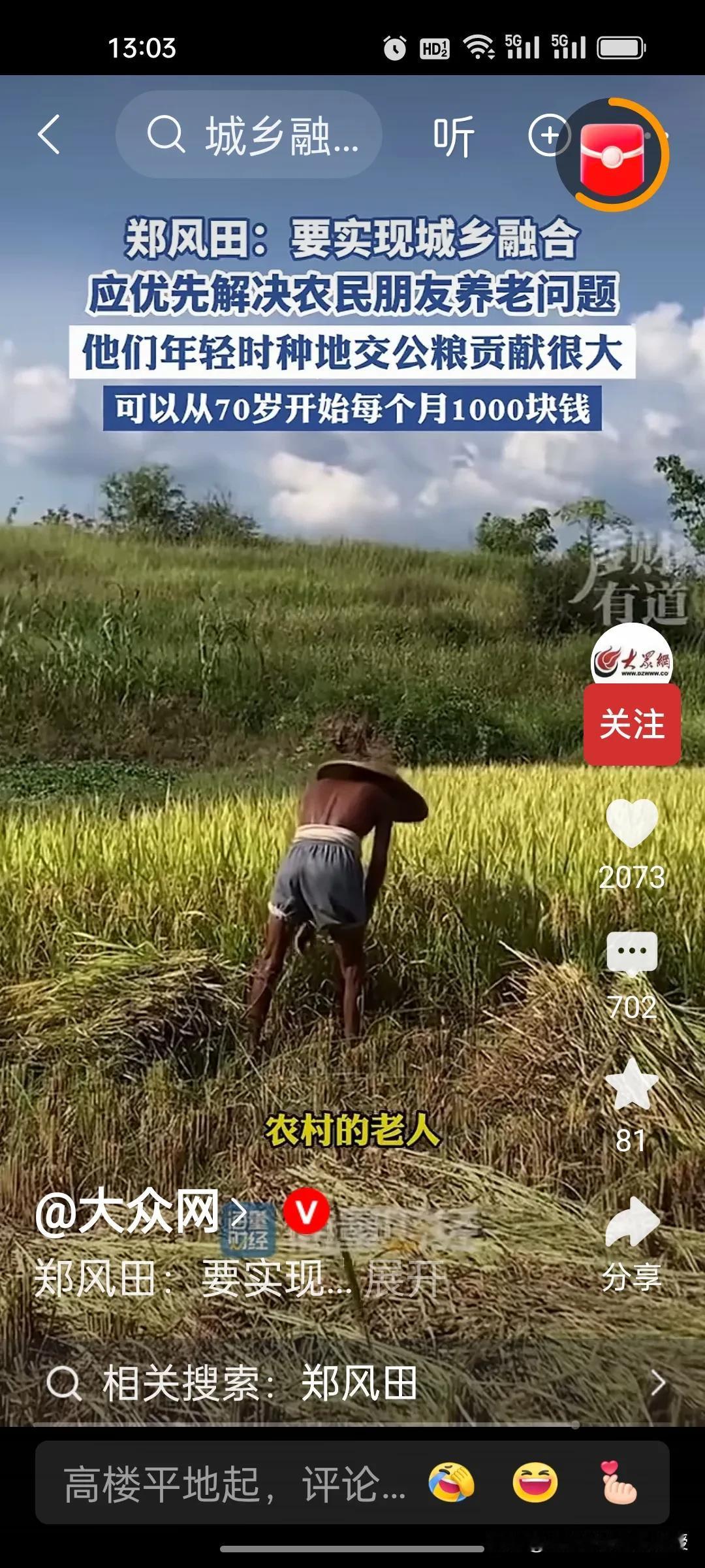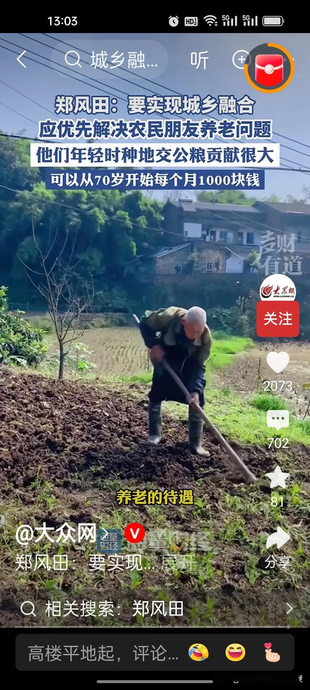人大教授郑风田建议要给70岁以上农村老年人每月发1000元,解决农民养老问题,以此来实现城乡融合。因为他们年轻时交公粮对国家的贡献很大,有一些专家说从60岁开始给他们发养老金,可能承担的压力太大。因此,郑教授认为从70岁开始给农民发养老金,让他们享受到有尊严的养老待遇。 目前中国70岁以上农村老年人合计约4529.81万,这些老年人的年收入中位数仅6000元左右,平均一个月只有500块,增加农村老人的收入,提高他们的消费能力,也是扩大内需,提振消费的重要举措。