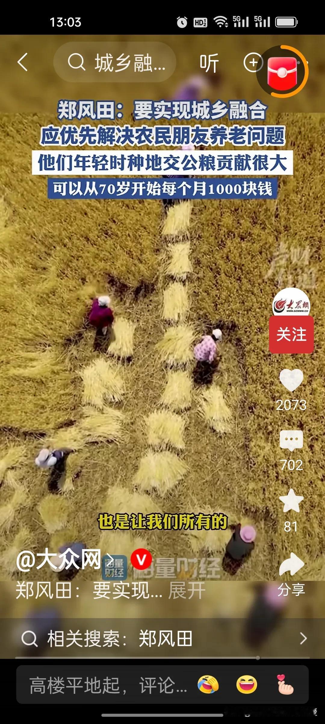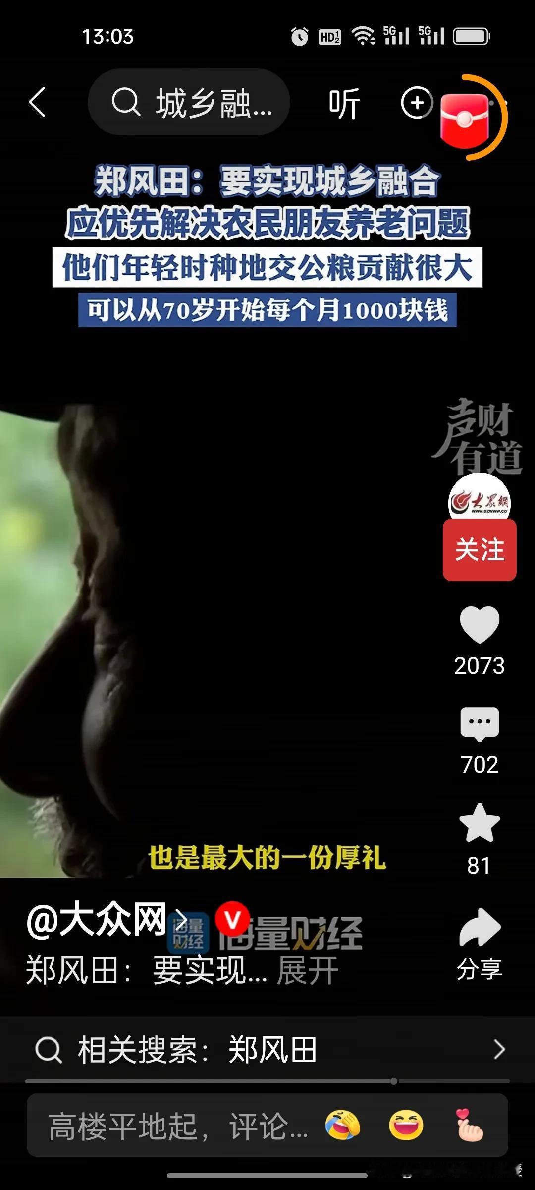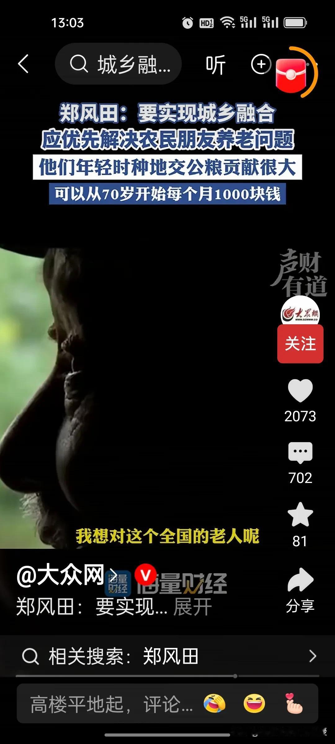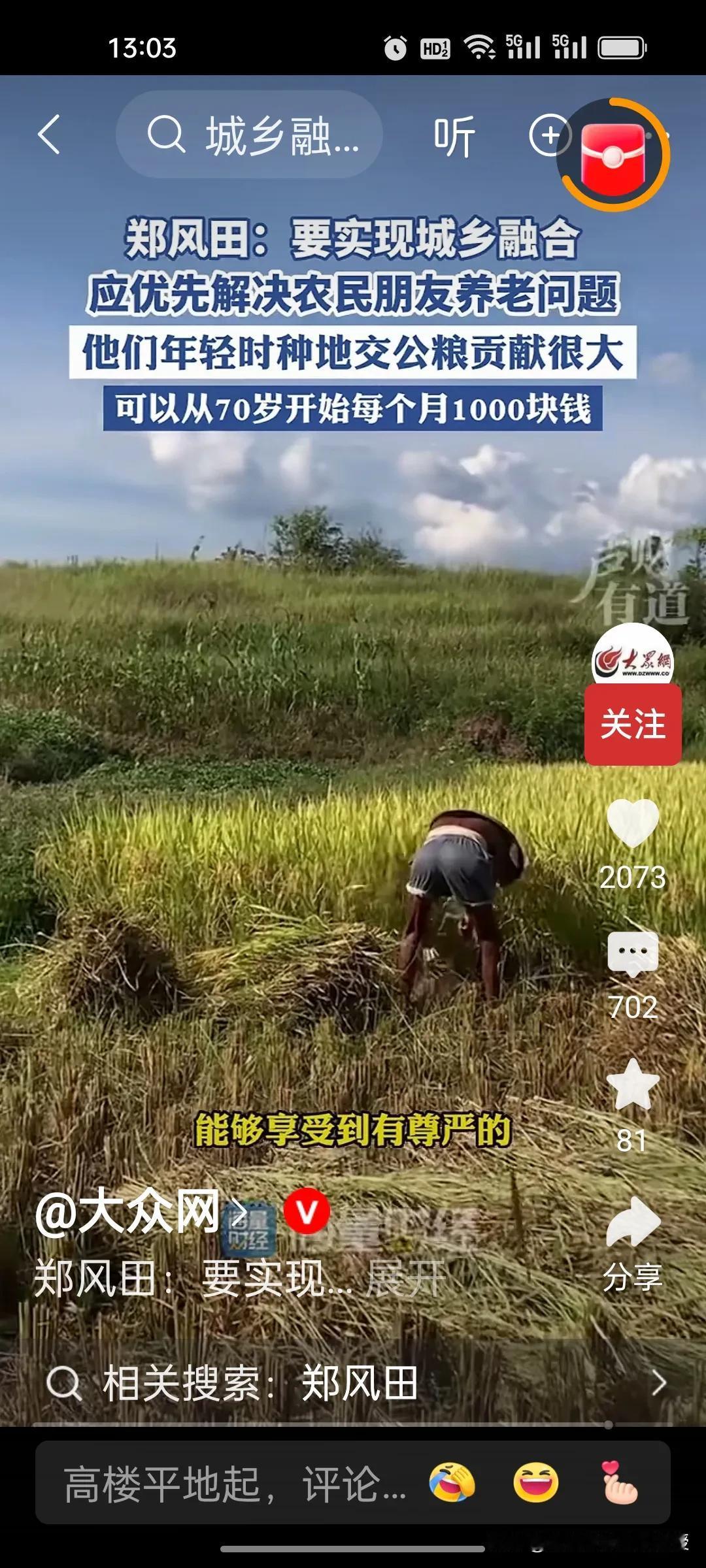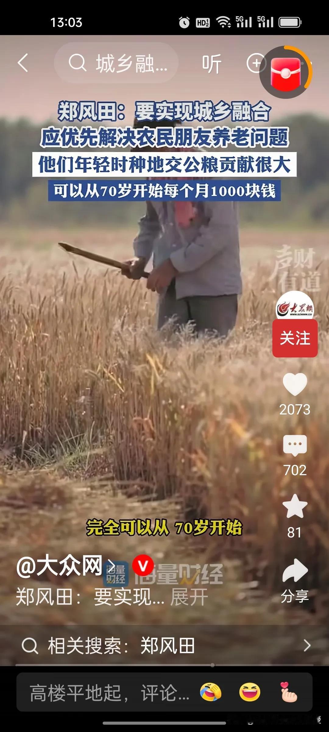 人大教授郑风田建议要给70岁以上农村老年人每月发1000元,解决农民养老问题,以此来实现城乡融合。因为他们年轻时交公粮对国家的贡献很大,有一些专家说从60岁开始给他们发养老金,可能承担的压力太大。因此,郑教授认为从70岁开始给农民发养老金,让他们享受到有尊严的养老待遇。 目前中国70岁以上农村老年人合计约4529.81万,这些老年人的年收入中位数仅6000元左右,平均一个月只有500块,增加农村老人的收入,提高他们的消费能力,也是扩大内需,提振消费的重要举措。