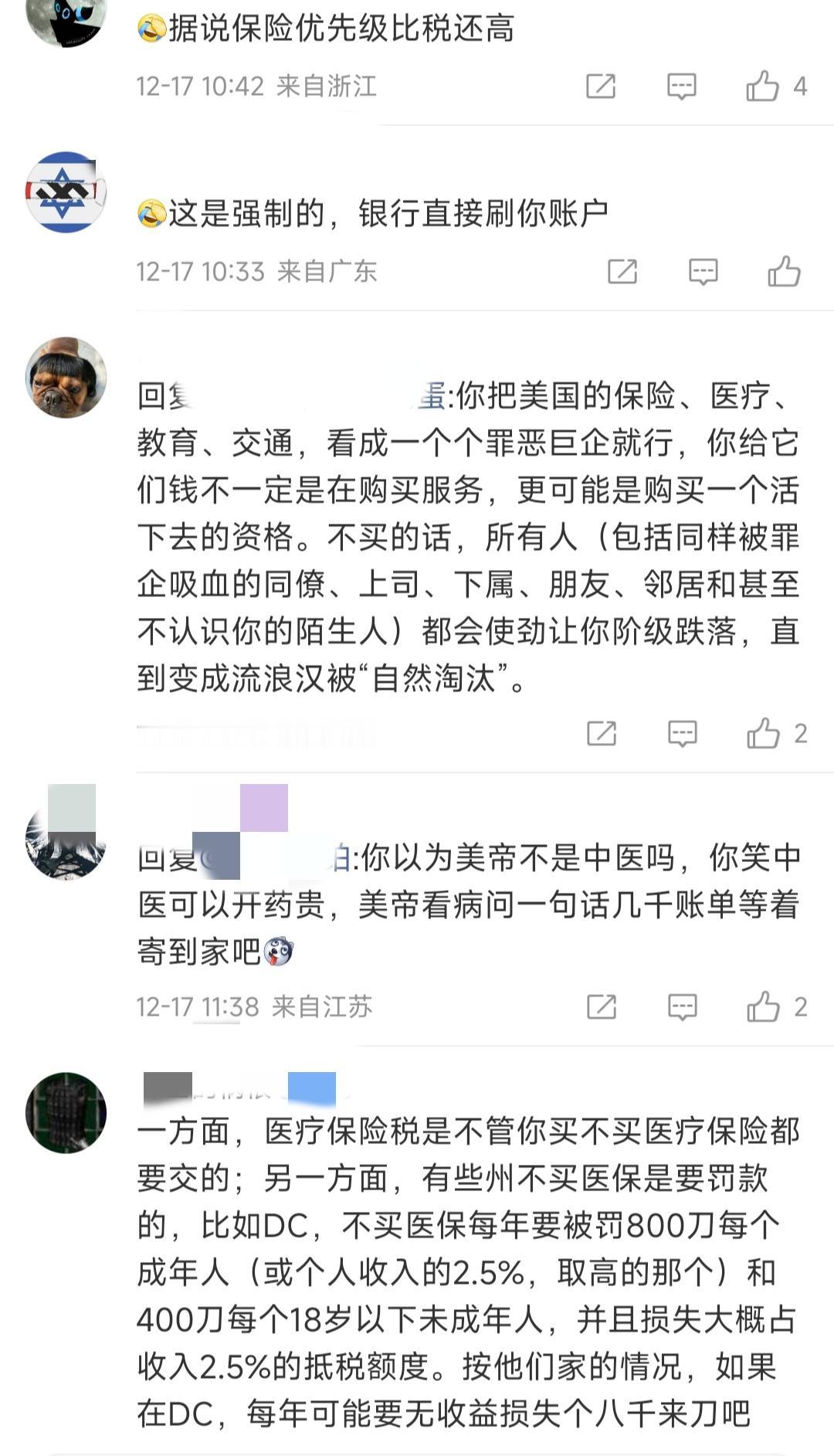 美国制度,越了解,越离谱。 你只要出生在美国,除了富人,你基本上就是进入了斩杀线。 一个美国女子讲:我丈夫最近失业了,以前他是购买医疗保险的人。现在她税后工资2600刀,买1700美元家庭医疗套餐花1100美元(可能根据平价医疗法案减税了),还剩1800美元,需供5个孩子和2个大人的生活。只有领食品券继续生活了。 她称:“所以,我想我们只有死路一条了。” 那有人好奇,医疗保险费那么贵,那我直接不买,不行吗? 答案是:不行,你非买不可。不买,医院不会给你看病。更重要的是,你不买医疗保险,州政府会罚你的款。有的州罚800刀(成人),400刀(18岁以下未成年人),还不抵税。每年可能要让你无收益损失个八千来刀。 如果买医疗保险,上班的话,公司强扣。失业的话,自己交,交保险费的优先级高于银行贷款、税收。你税还可以自己申报,医疗保险银行直接划扣。 失业了,你就进了医疗斩杀线。没失业,你同样进了医疗半斩杀线。 没工作,不交医疗保险,有病了没法治,还要被罚款,进入双斩杀线。 所以,一些美国人宁愿当流浪汉,也有的去墨西哥看病。 一个英国女子,全家都是医疗系统的,看个病要排到明年4月份。所以,她跑到中国医院来看病,便宜、快捷,效率高,惊呆一众外网网友,播放量几百万。 所以,中国医疗经济会不会进入下一个蓝海:医疗旅游!