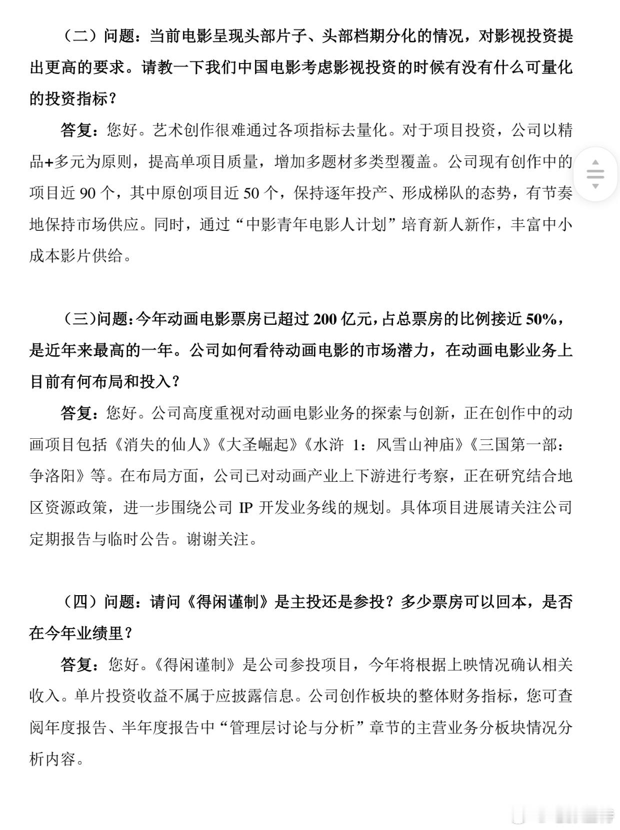 听听温特怎么说 中国电影产业集团上周五第三季度业绩交流会提到了公司的储备项目,也提到《得闲谨制》是参投项目,也提到目前创作近90个项目。明年将上映科幻冒险题材影片《星河入梦》、奇幻冒险动画电影《大圣崛起》、历史战争题材影片《澎湖海战》、谍战悬疑影片《抓特务》、犯罪剧情影片《用武之地》、现实主义题材影片《欢迎来龙餐馆》等。“中影青年电影人计划”影片《飞行家》《没问题》《呼吸》《狮子回头》《非传统浪漫关系》等项目也计划明年上映。