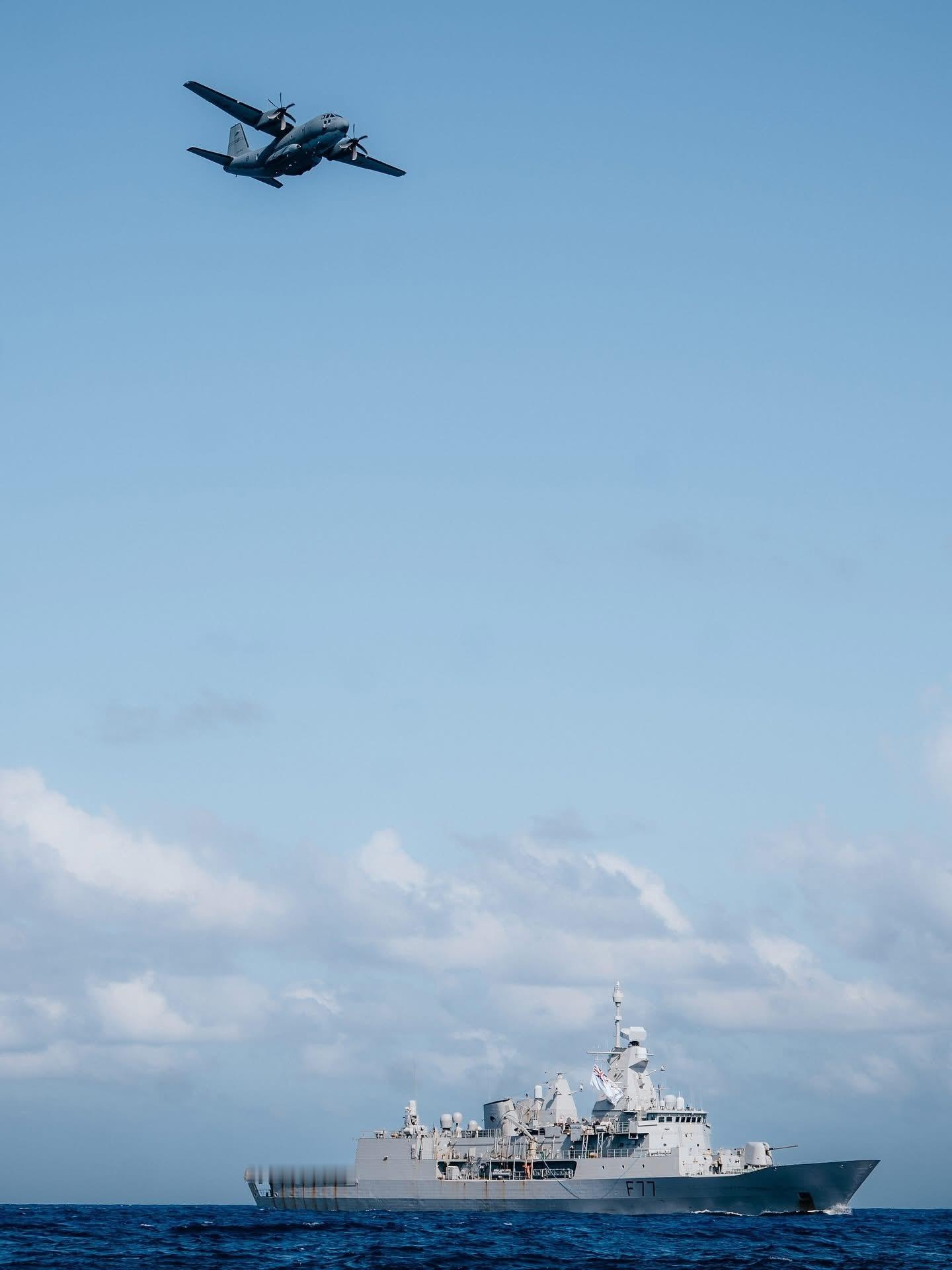 澳大利亚空军(RAAF)第35中队C27J与新西兰海军(RNZN)安扎克级特卡哈号(HMNZS Te Kaha, F77)护卫舰同框军用飞机信息汇中外舰闻