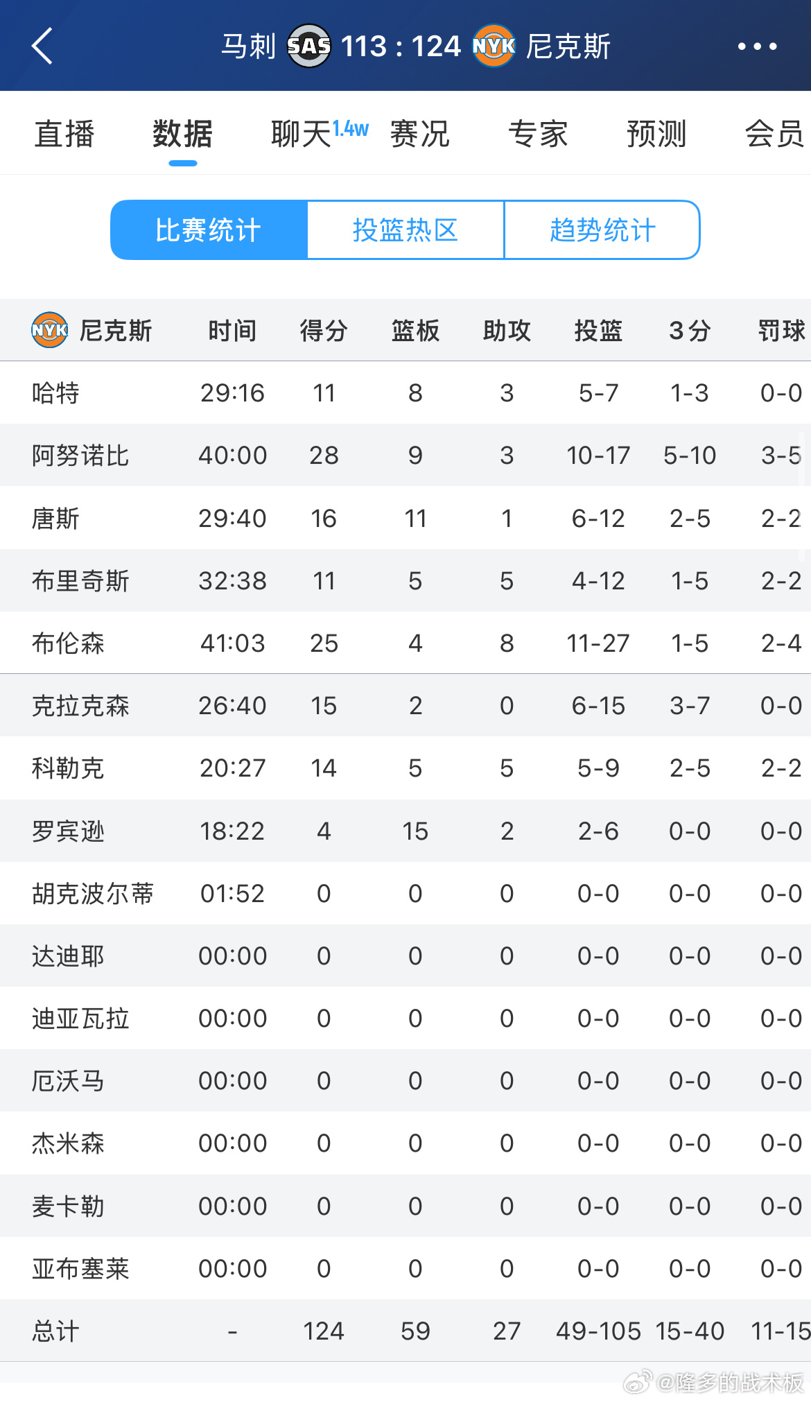 尼克斯124-113力克马刺,赢得本届杯赛冠军🏆阿奴诺比28分9板,布伦森25