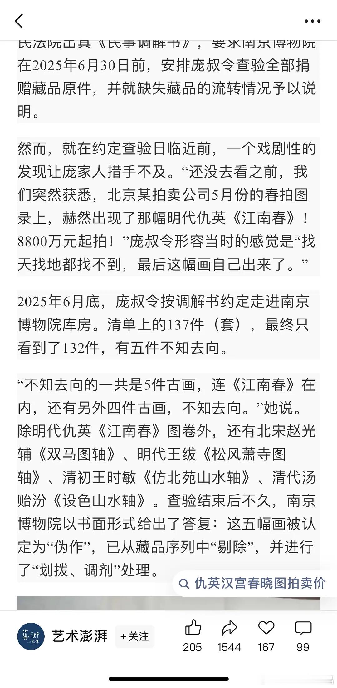 文物界大事,南京博物院受捐赠的古画出现在拍卖会上!就是庞家后人捐赠给南京博物院明代画家仇英的画,被南京博物院说是假画,但是假画可以退还啊,但是南京博物院就是不退,说要自行划拨,结果被庞家后人发现该画作为真迹出现在拍卖会上。