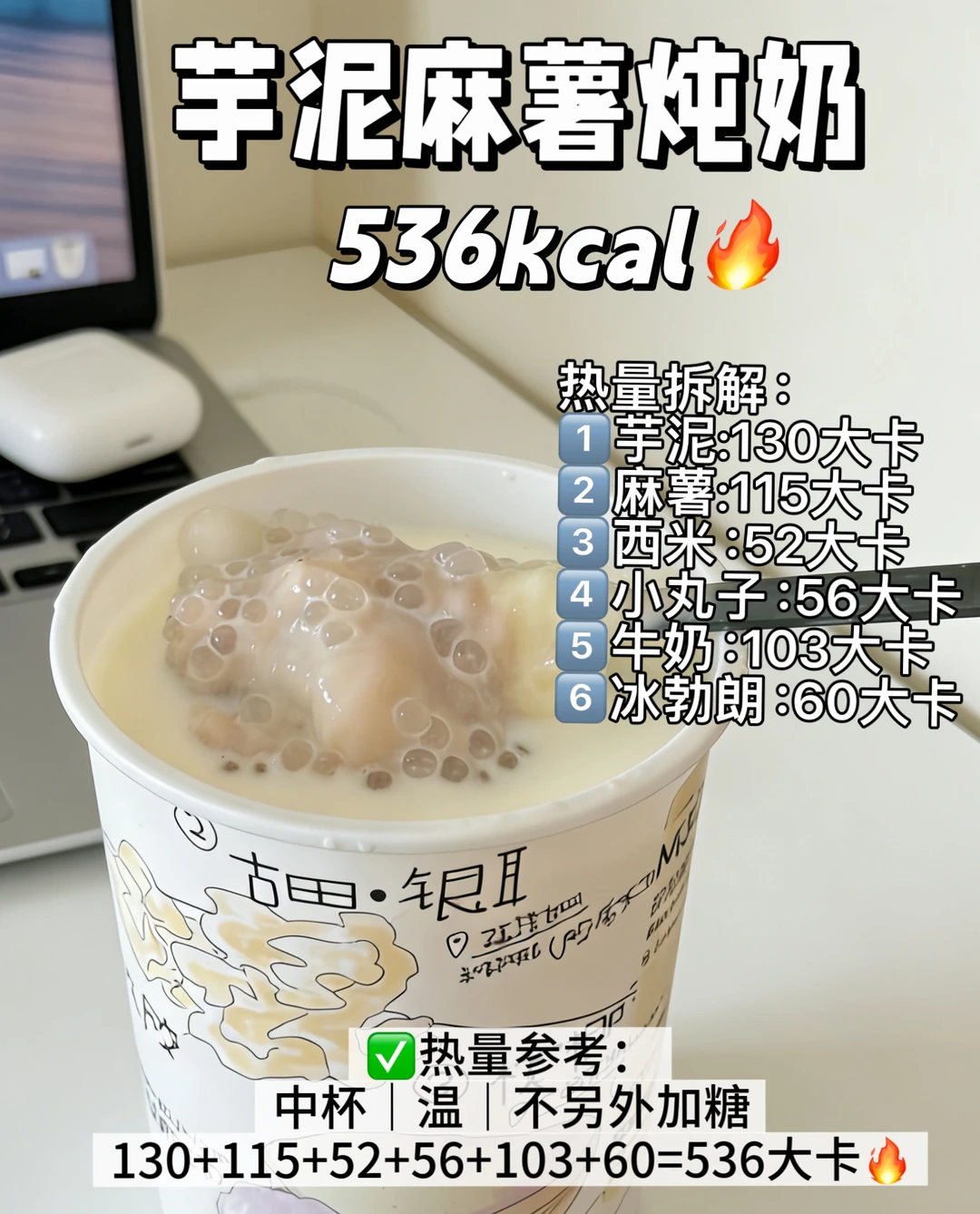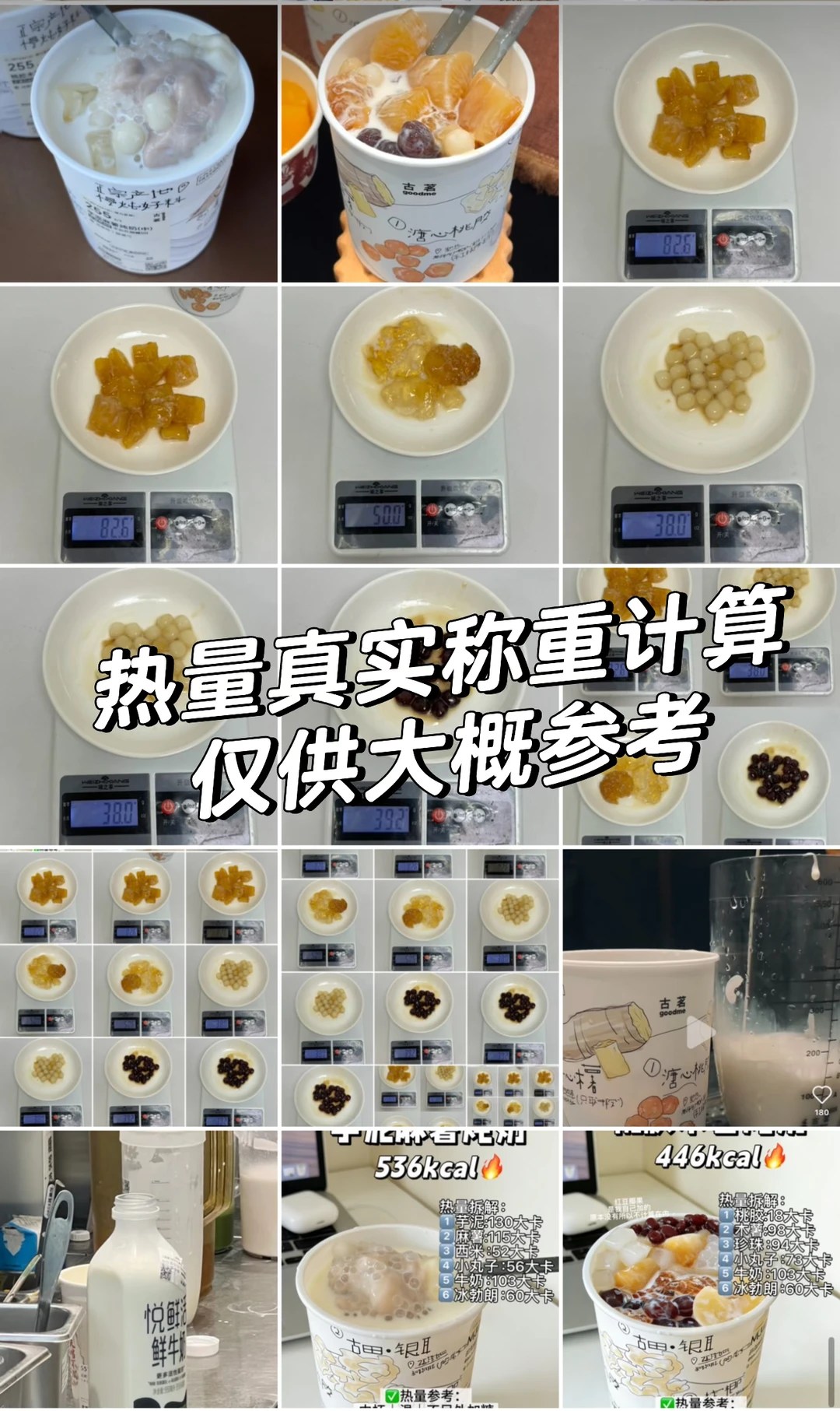 挑战100杯秋冬奶茶热量测评!!(第三期) 1️⃣ 芋泥麻薯炖奶 热量拆解:🔥 1.芋泥:130大卡(24年的古茗物料热量) 2.麻薯:115大卡 3.西米:(80ml)52大卡 4.小丸子: (39g) 76大卡(参考市面上成品热量) 5.牛奶: (150ml) 103大卡(悦鲜活) 6.冰勃朗: (25ml) 60大卡(参考奶茶制作过程) ✅所以中杯|温|不另外加糖的热量共计: 130+115+52+56+103+60=536大卡🔥 ——————————————————— 2️⃣桃胶木薯炖奶 热量拆解:🔥 1.桃胶银耳:(50g)18大卡(泡发后热量计算) 2.木薯:(82g)98大卡 3.黑糖珍珠: (39g) 94大卡 4.小丸子: (38g) 73大卡(参考市面上成品热量) 5.牛奶:(150ml)103大卡(悦鲜活) 6.冰勃朗:(25ml)60大卡(参考奶茶制作过程) ✅所以一杯中杯|温|不另外加糖的热量共计: 18 + 98 + 94 + 73 + 103 + 60 = 446大卡🔥 ———————————————————— 📝注:不同门店不同店员打小料的克重会有细微差别,不会完全一致,热量纯个人估算,仅供大概参考!!