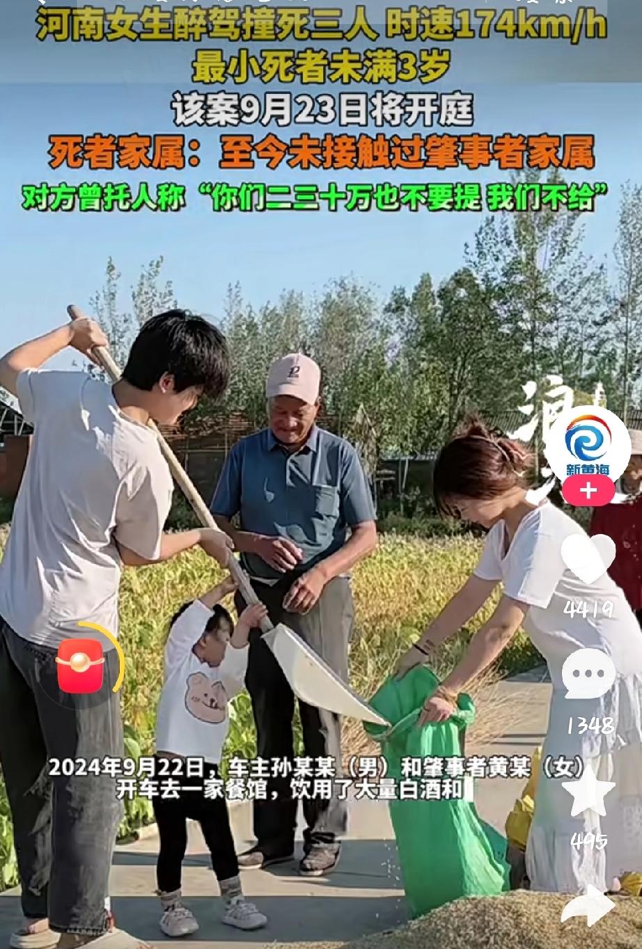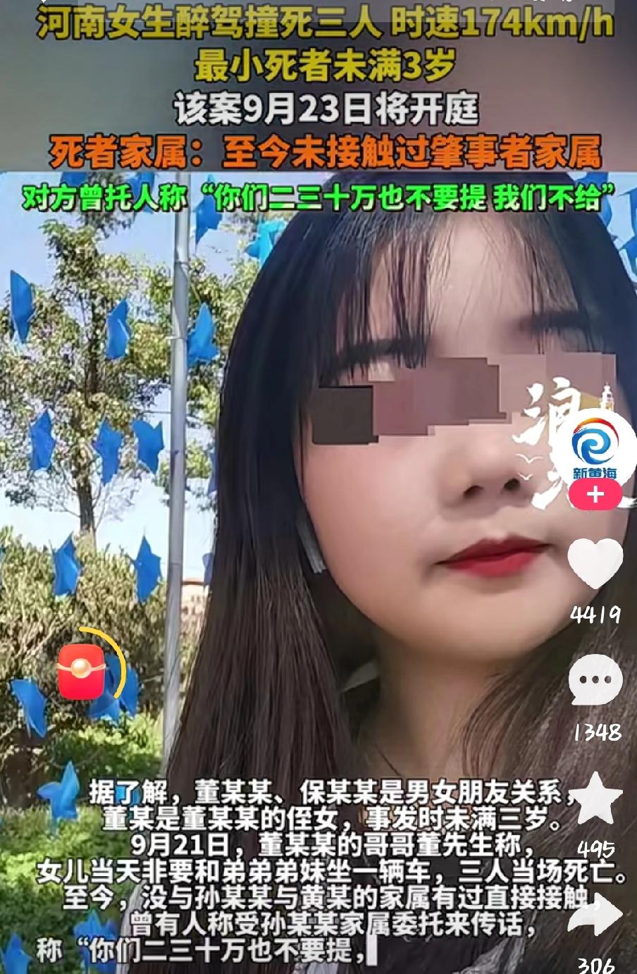 撞死3个人却二三十万也不给?00后女子醉驾撞死三人,最小死者还不到3岁,这么狂的口气引众怒 这起案件的肇事者是河南信阳的,当天她醉驾撞死三人,最小的死者不满3岁,该案件将于2025年9月23日在信阳市中级人民法院开庭审理。 案件发生于2024年9月22日晚,在河南信阳市明港镇,车主孙某某(男)和肇事者黄某(女)在餐馆饮用大量白酒和啤酒后,黄某向孙某某索要汽车钥匙,独自驾车行驶在省道上,追尾了董某某驾驶的载有董某(董某的侄女还不到3岁)、保某某(董某的女朋友)的电动车,导致三人当场死亡 。 据交通事故认定书,事发时黄某驾驶车辆时速高达174km/h,黄某血液酒精含量为203mg/100ml,属于醉酒驾驶,承担事故全部责任 。 死者家属表示,至今未接触过肇事者家属,只有一次快过年的时候,自称是受孙某某家属委托的人来传话,称“你们二三十万也不要提,我们不给,也没有,之后他的意思是,我们没有犯多大错,也没多大的罪” 。3条鲜活的生命就这样离世,却说没多大的罪?二三十万都没有?这波操作简直引起众怒了。这做法无疑是对生命的漠视,更是对法律的挑衅! 董某某的哥哥董先生称自己和妻子就这一个女儿,事发当天也正是农忙的时候,他的弟弟弟媳以及妻子都去外婆家帮忙,干完活出去吃饭的时候,女儿非要和叔叔婶婶(死者董某某,保某某)坐一辆车,没想到却遭此横祸。时隔一年了,一家人至今都不敢提及车祸的相关事情。董先生的母亲悲痛欲绝,得输营养液维持,他的妻子目睹了女儿的离世一直精神恍惚,这起事故给这个家带来了巨大的灾难。对于肇事者黄某,家属希望能判死刑,对于车主孙某某,家属希望严惩,争取最大量刑 。 2025年9月23日,该案将在信阳市中级人民法院开庭审理 。明知不可酒驾,车主孙某某不仅不阻止,还把钥匙交给同样饮酒的肇事者,这无疑是在纵容犯罪。一个3岁的孩子,还没来得及好好看看这个世界就被无情的剥夺了生命,更是让人心痛不已!目前,社会各界都在密切关注着这起案件的后续进展。大家都期待着法律能够给出公正的裁决,让逝者得以安息,让受害者家属的心灵得到慰藉。相信法律会以事实为依据,以法律为准绳,给社会一个公正的交代。