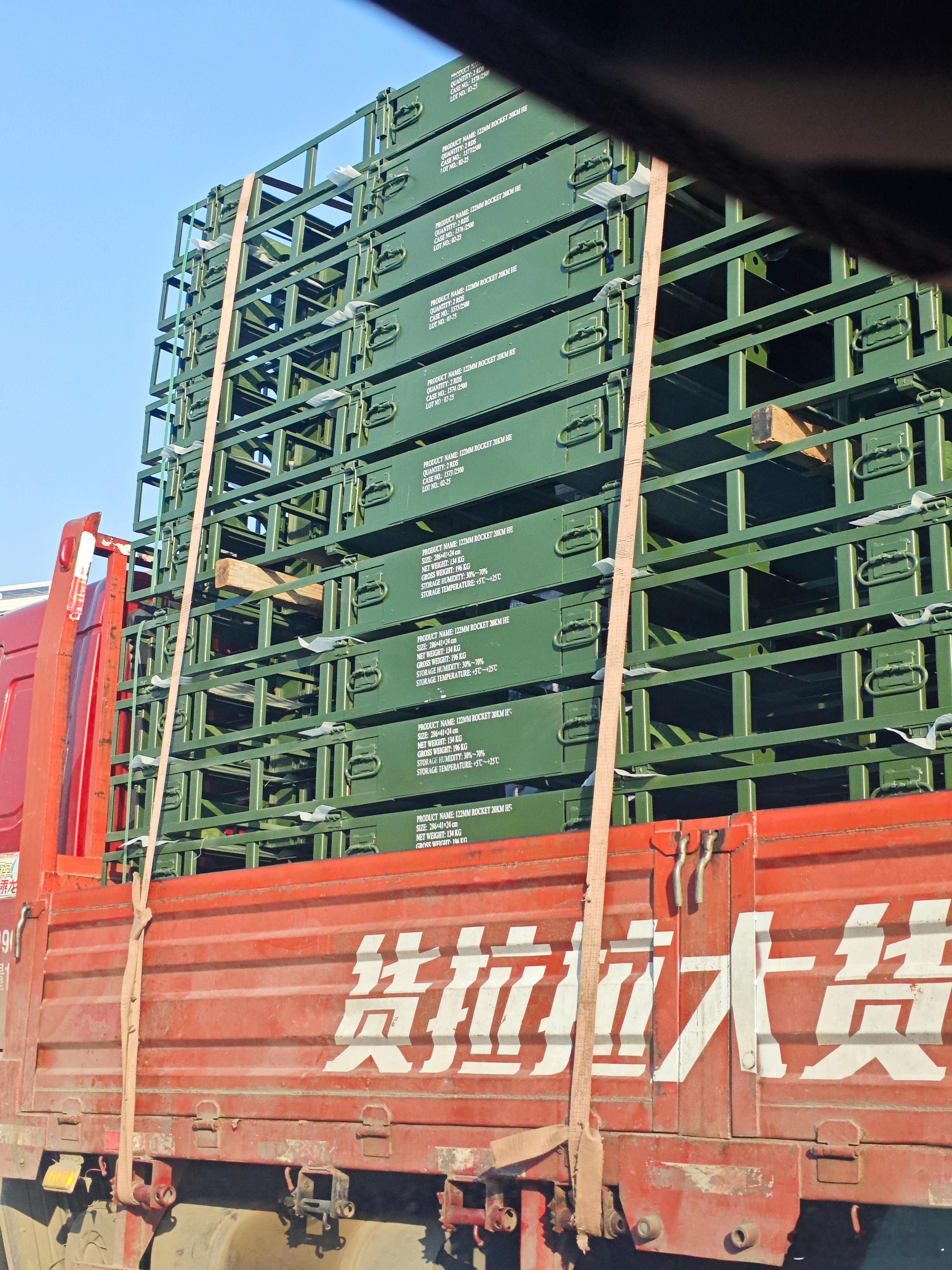 远看这个军绿色就知道不简单,近看果然,122MM火箭炮的运输箱,一箱两枚,射程20公里,高爆弹,全英文应该是外贸款。