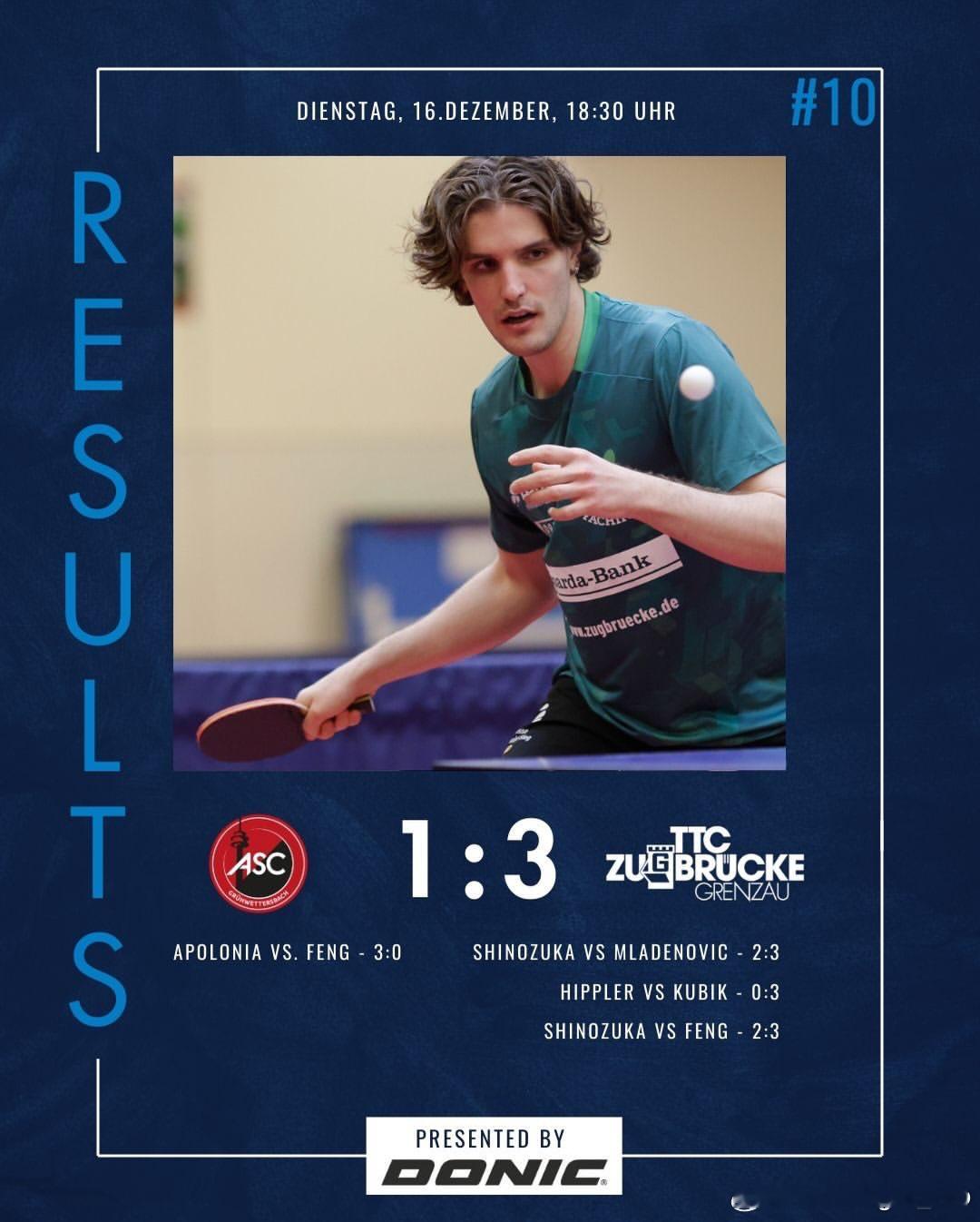 12.16 德甲联赛 TTC3-1ASC卢卡3比2篠塚大登冯翊新0比3阿波罗尼亚库比克3比0希普勒冯翊新3比2篠塚大登